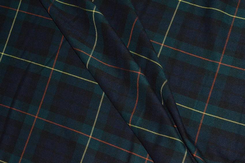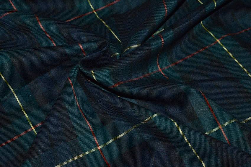 Tessuto di mano pettinata ed elasticizzata. La fantasia a scacchi verde e blu viene arricchita da linee gialle ed arancioni che attraversano la stoffa su tutta la sua altezza.Di pesantezza media è ideale per la realizzazione di gonne dritte o a pieghe, giacche, pantaloni ed abbigliamento autunno/inverno sia da donna che da uomo.