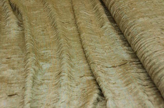composizione 100% poliestere, altezza cm 300 con piombo finale, tessuto stropicciato di media pesantezza dall'aspetto lucido con riflessi blu su base dorata, idoneo per la confezione di tende arricciate
