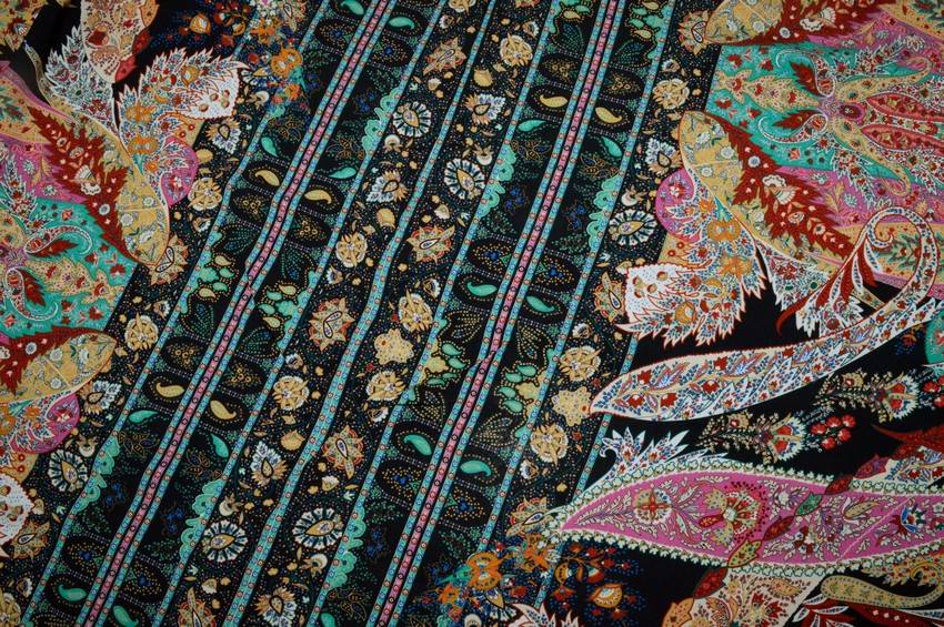 Bellissimo tessuto in pura viscosa che dona freschezza sulla pelle grazie alla sua ottima mano morbida e cadente. Presenta inoltre un aspetto liscio e coprente. Il fondo nero viene vivacizzato dalla sgargiante fantasia che unisce diversi colori per un aspetto unico ed originale. Vi è in aggiunta una banda centrale di 25 cm. Utilizzato comodamente per confezionare capi per le stagioni primavera/estate come abiti lunghi, salariane, gonne e camicette.