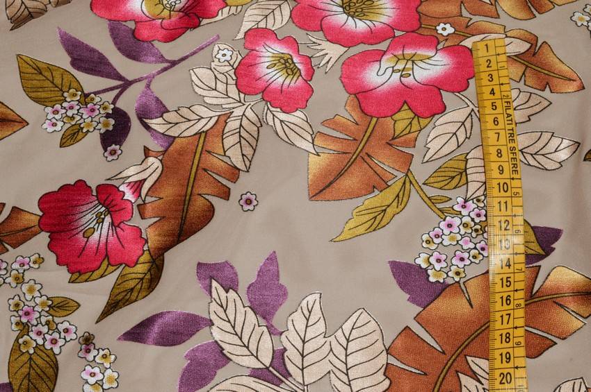 Bellissimo tessuto in pura viscosa dalla mano leggera, cadente e piacevolmente fresca. Il fondo semitrasparente beige viene impreziosito dalla graziosa fantasia fiorata color rame e rosa la quale dona vivacità e colore alla stoffa. Vi sono inoltre dei piccoli dettagli coprenti luminosi tipici dei tessuti devoreh.