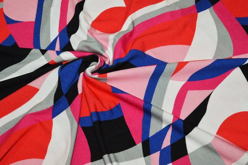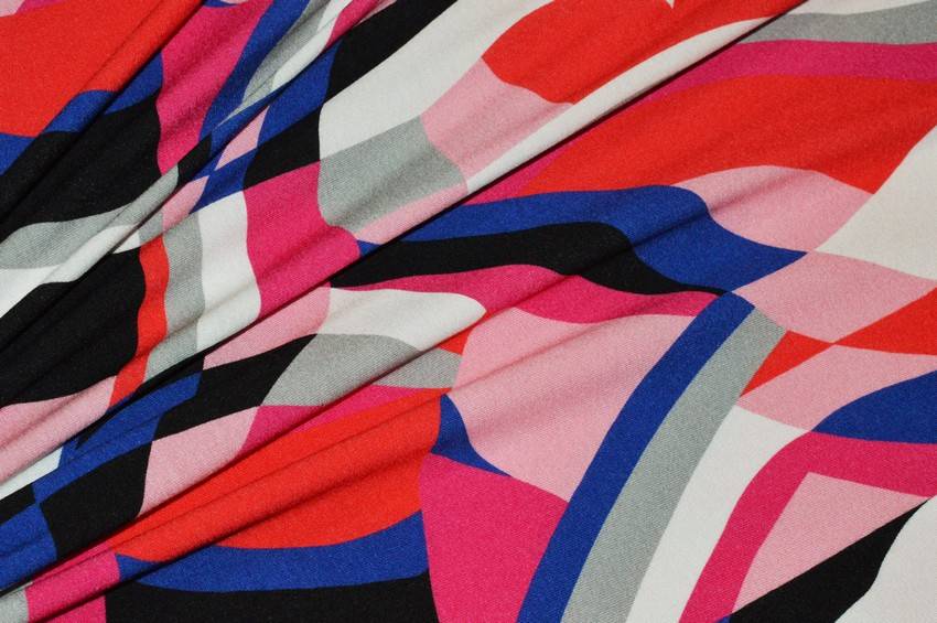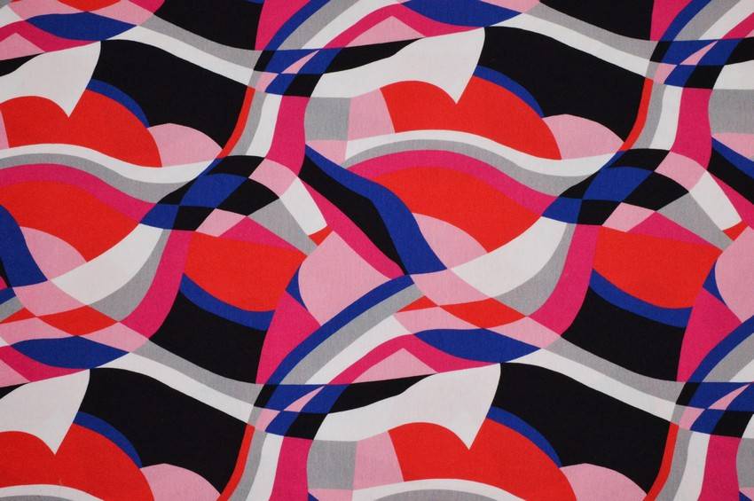 Tessuto in maglina di pura viscosa dalla mano elasticizzata, scivolosa, morbida e cadente unita ad un aspetto coprente. Il fondo viene vivacizzato dalla bellissima fantasia astratta composta dagli sgargianti colori come il rosa, il rosso ed il blu regalando unicità e carattere alla stoffa. Utilizzato comodamente per realizzare capi d'abbigliamento pratici come t-shirt, ma anche per abiti più lavorati e ricercati per le stagioni primavera/estate.
