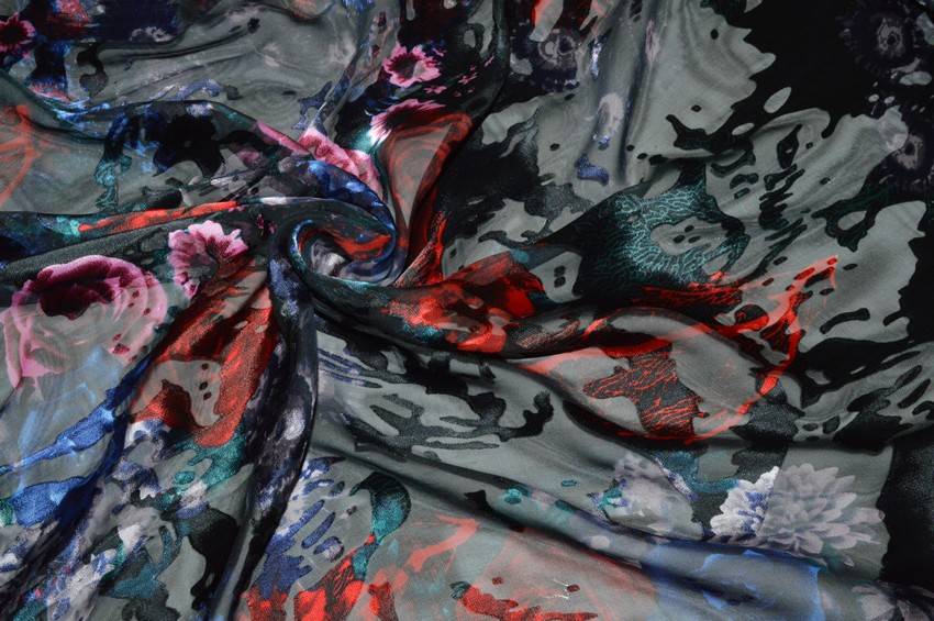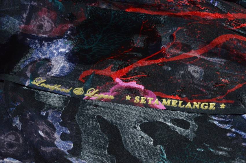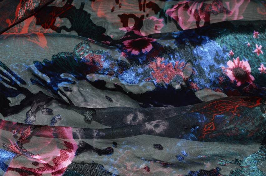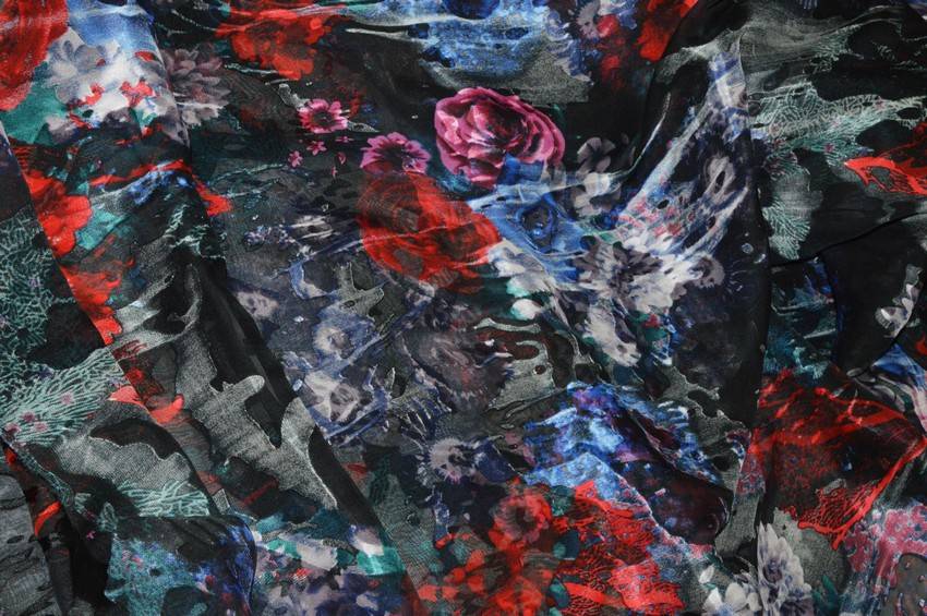 Il fondo semitrasparente nero viene impreziosito dall'elegante fantasia fiorata la quale dona carattere e movimento alla stoffa. Vi sono inoltre dei piccoli dettagli coprenti dall'aspetto luminoso, tipici dei tessuti devoreh.