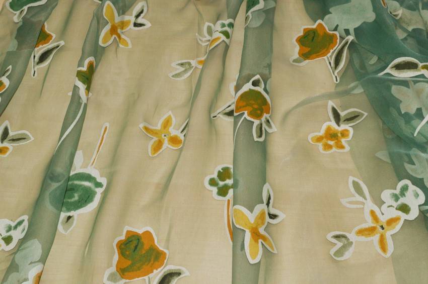 Splendido tessuto con leggero fondo in organza dall'aspetto cadente e molto trasparente. La base viene particolarizzata dalla delicata colorazione verde salvia unita a dettagli coprenti floreali di differenti forme e gradazioni di giallo ed arancio. Ideale per realizzare tende doppie e/o arricciate di ogni tipologia.