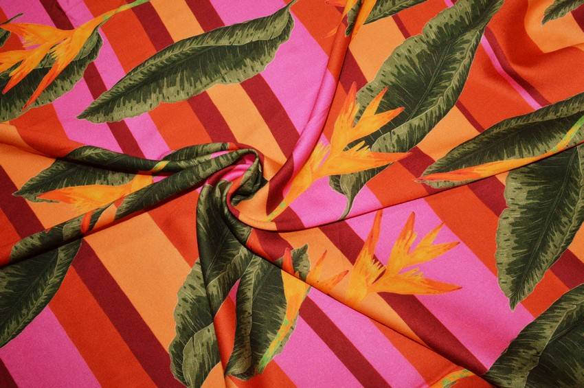 Tessuto in pura viscosa molto piacevole sulla pelle grazie alla sua leggerezza e freschezza. Risulta inoltre morbido, cadente e coprente. Il fondo viene composto da bande arancioni, rosse, rosa e gialle di diverso spessore, impreziosite dal dettaglio floreale a contrasto. Utilizzato comodamente per la realizzazione di modelli per capi estivi come graziose camicette, gonne ed abitini.