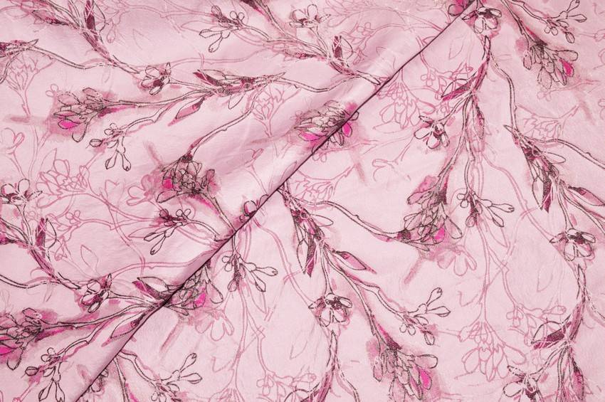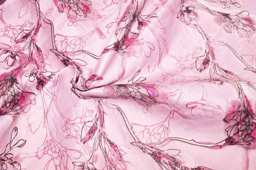 Splendido tessuto di struttura sostenuta unita ad un fondo coprente e luminoso. La base rosa viene impreziosita dall'elegante fantasia fiorata la quale unisce differenti forme floreali. A completare il disegno vi sono minuziosi e delicati motivi naturalistici in lurex argentati con base nera che donano brillantezza e raffinatezza alla stoffa. Di peso ottimale per la realizzazione di giacche, bolerini ed altre tipologie di capi d'abbigliamento elegante.