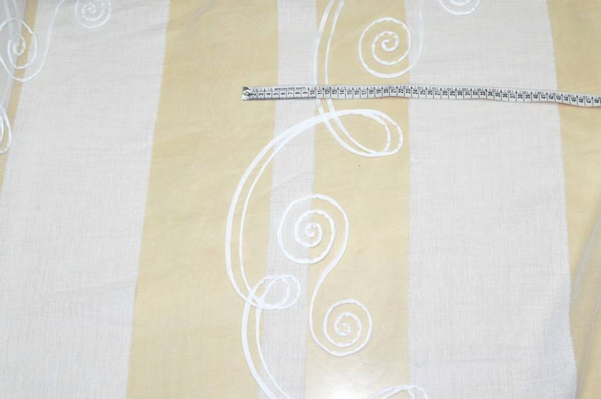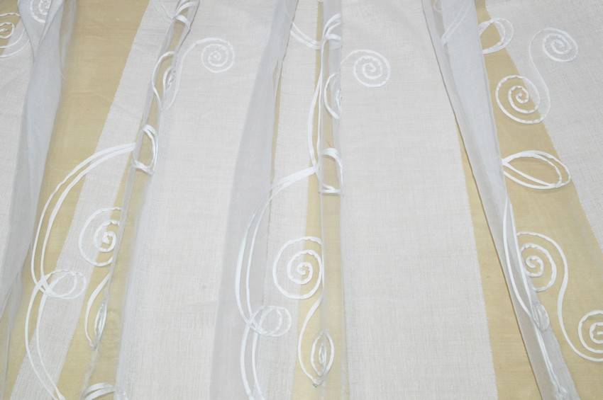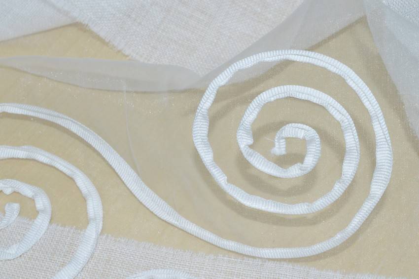 Elegante tessuto di fondo bianco naturale composto da fasce da 6 cm e 20 cm di diversa coprenza le quali donano alla stoffa movimento. Si presenta inoltre cadente, leggera e filtrante alla luce grazie agli inserti in organza. La base viene inoltre decorata da una raffinata fettuccia cucita in modo tale da costruire un'elegante disegno lungo tutta l'altezza della stoffa. Ideale per realizzare ogni modello di tende arricciate.