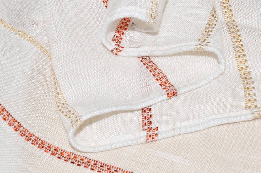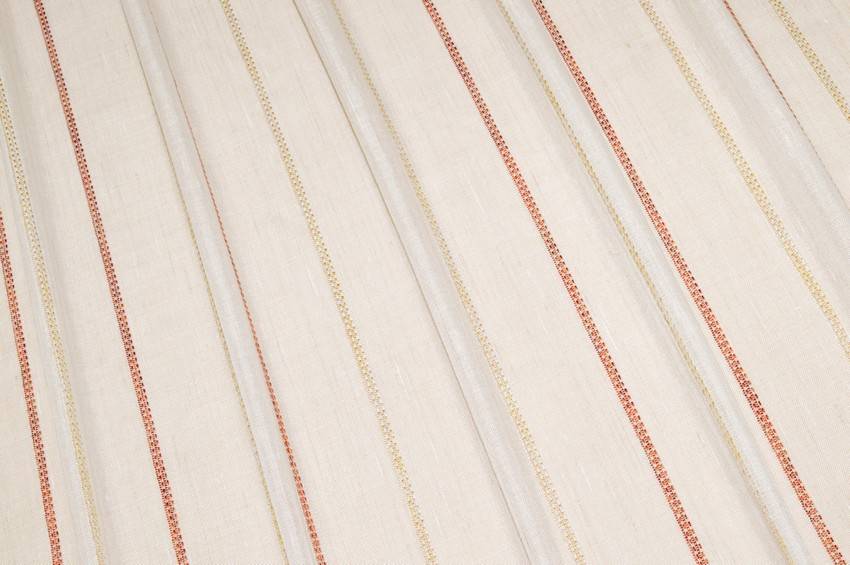 Tessuto per tende in misto lino realizzato interamente in Italia con fondo bianco naturale decorato da sottili e delicate fiammature beige. Vi sono inoltre piccole fasce arancioni e beige che compongono la graziosa fantasia rigata. Presenta un aspetto leggero, cadente e filtrante alla luce, perfetto per arredare i propri spazi realizzando tende arricciate di ogni modello.