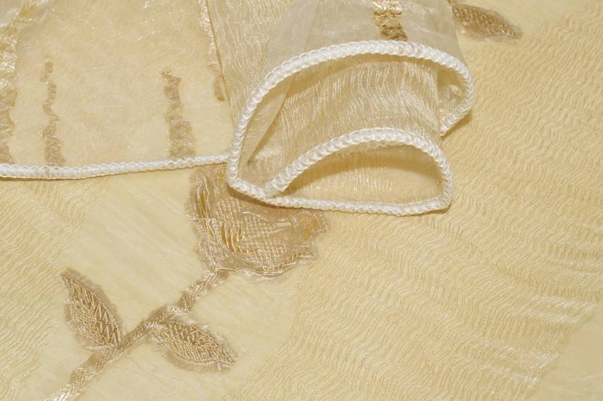 Tessuto con fondo beige in organza dall'aspetto semitrasparente, cadente e leggero, reso luminoso dalle striature e dai motivi floreali lucenti color oro chiaro. Semplice, ma raffinato è ideale per realizzare splendide tende arricciate di ogni tipo.