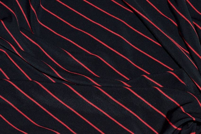 Maglina in viscosa bi-elastica dalla mano scivolosa, cadente, fresca e coprente. Presenta il fondo nero decorato da sottili linee verticali rosse. Idoneo per la creazione di capi d'abbigliamento primavera/estate come magliette, canotte, t-shirt ed abitini.