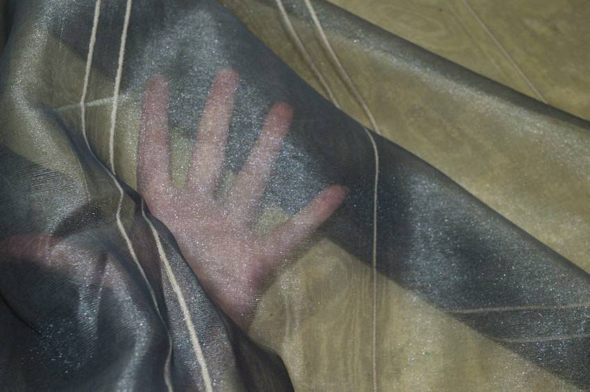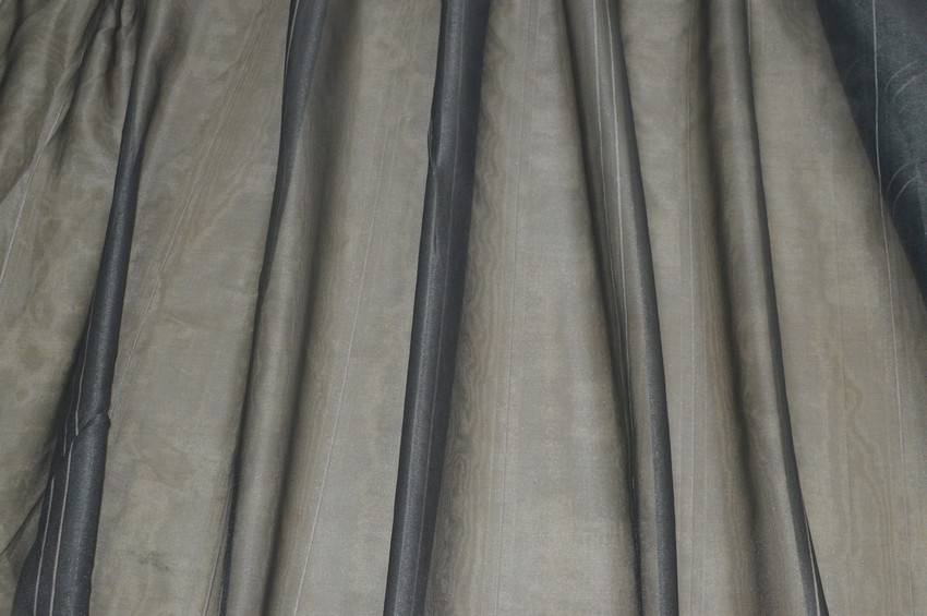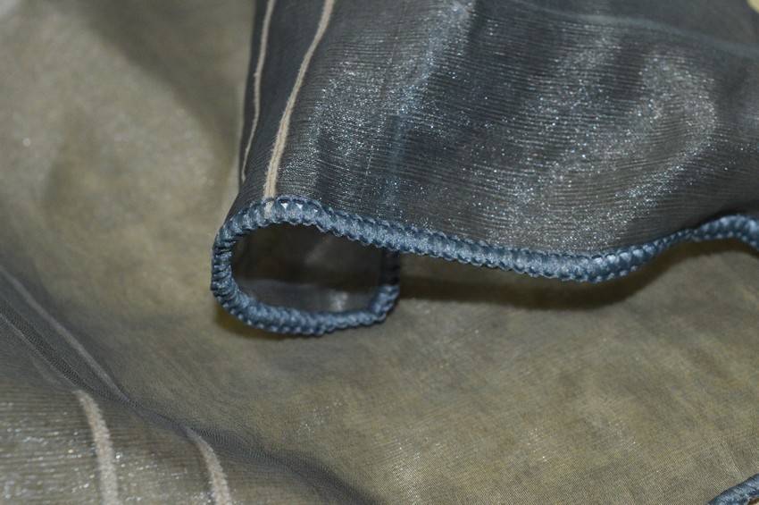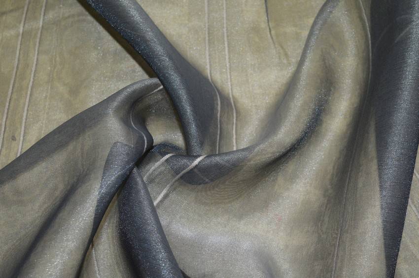 Particolare tessuto per tende composto da due strati di organza grigia (grigio caldo) uniti tra loro dalle sottili e delicate linee beige. La stoffa si presenta luminosa, cadente, leggera e molto trasparente, perfetta per arredare i propri spazi realizzando tente arricciate di ogni tipologia.