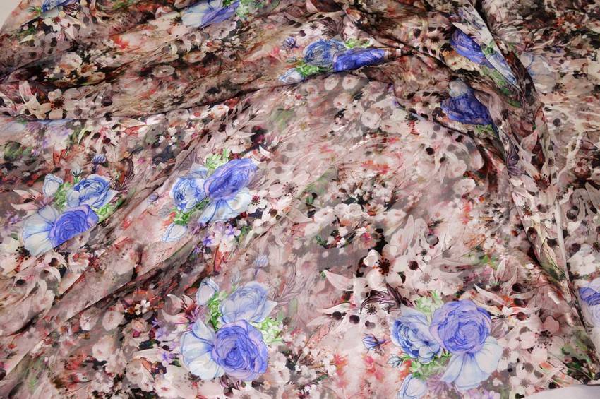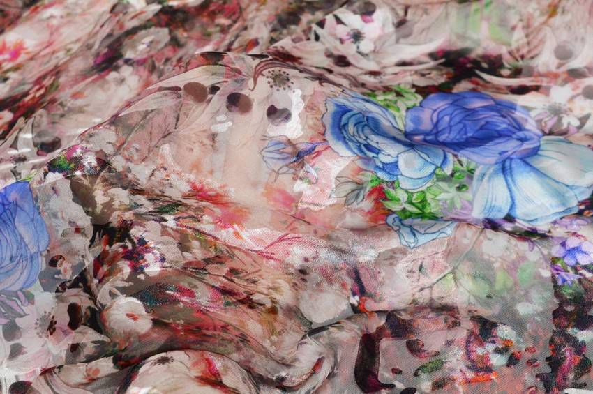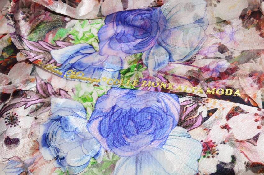 Il fondo semitrasparente viene impreziosito dall'elegante fantasia fiorata la quale mescola differenti gradazioni di rosa con elementi naturalistici azzurri a contrasto. Vi sono inoltre dei piccoli dettagli coprenti dall'aspetto luminoso, tipici dei tessuti devoreh.