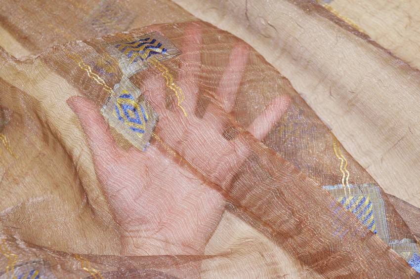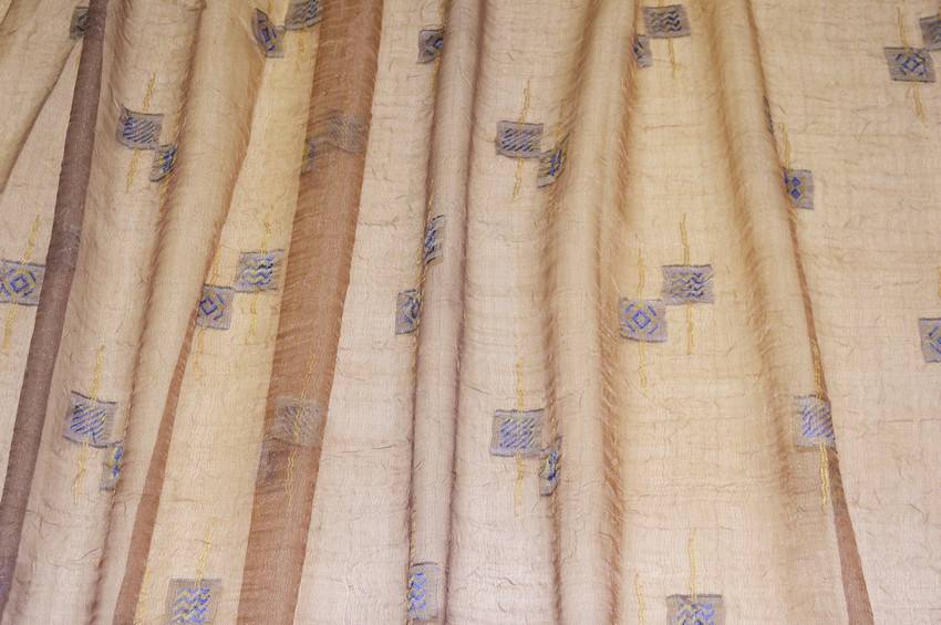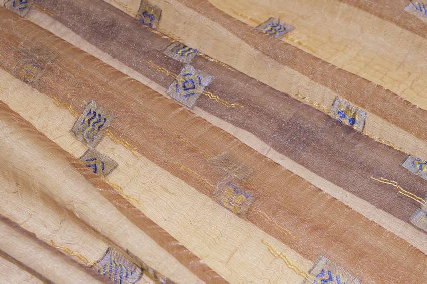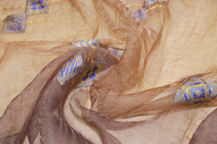 Splendido tessuto in organza stropicciata idoneo per la realizzazione di tendaggi dalla mano cadente e leggera unita ad un aspetto trasparente e filtrante alla luce. Il fondo presenta una lussuosa ed elegante colorazione effetto cangiante la quale cattura differenti sfumature e nuance dal rame al viola. Viene inoltre arricchito da piccole applicazioni dorate e blu per un aspetto prezioso ed unico. Ideale per confezionare tutte le tipologie di tende arricciate.