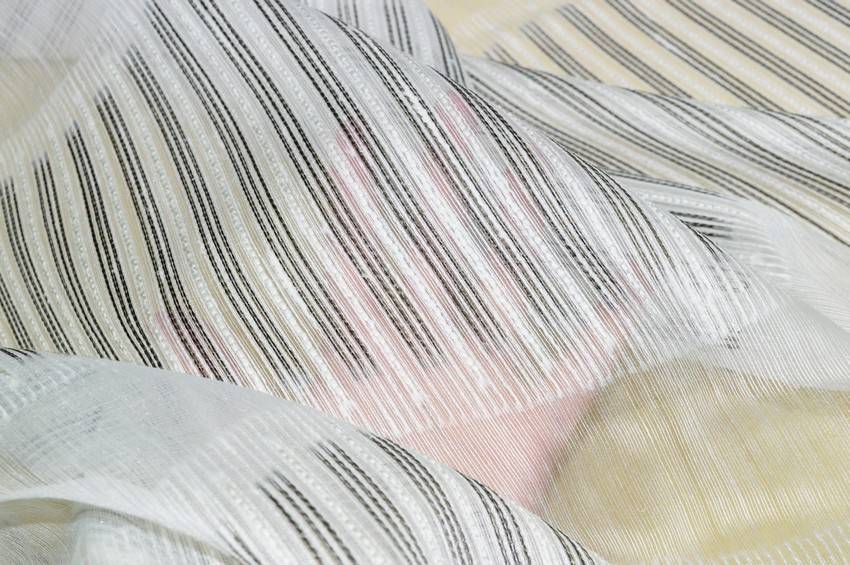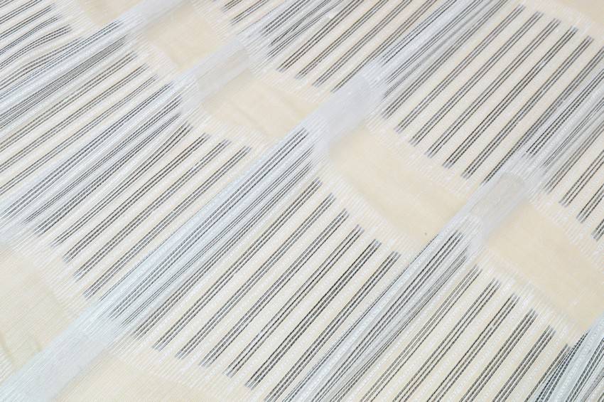 Tessuto per tende con elegante base grigio perla in organza leggera, cadente e semitrasparente. La fantasia presenta irregolari righe orizzontali composte a loro volta da sottili linee verticali nere e grigie ricamate. Ideale se si vuole realizzare moderne tende arricciate di ogni tipologia.