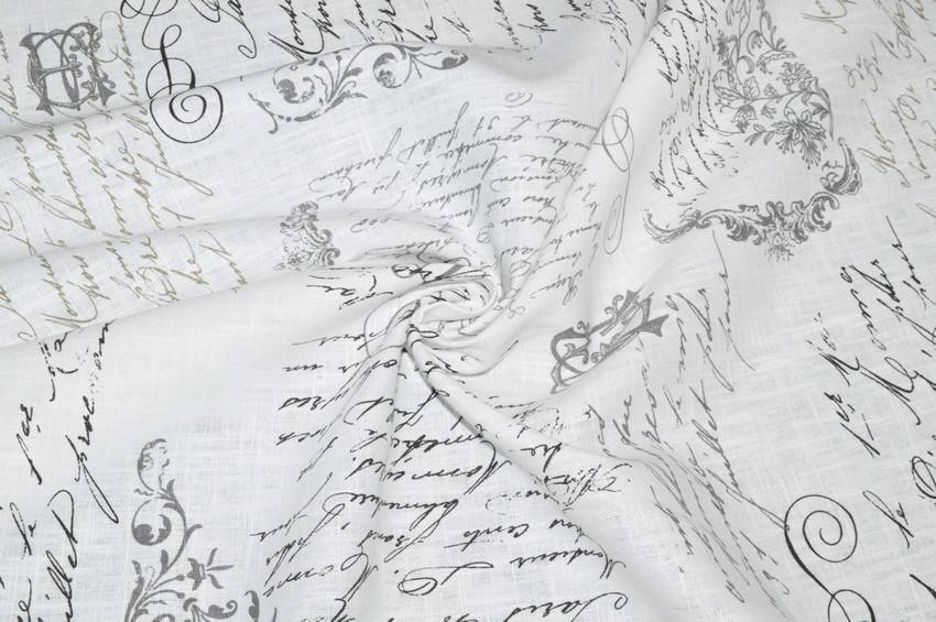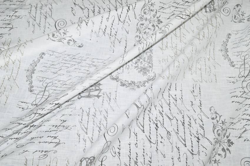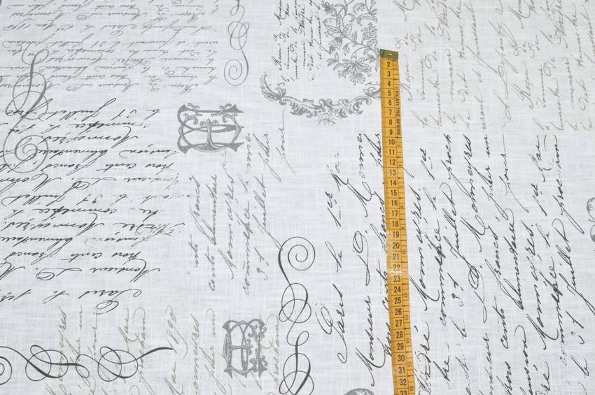 Splendido tessuto ideato per tovagliati realizzato in prezioso puro lino. Il fondo presenta una classica, ma elegante colorazione bianca impreziosita da scritte in stile vintage beige e grigie di differente grandezza e posizione. Perfetto per abbellire la propria cucina realizzando bellissime tovaglie e/o piccoli lavori d'arredo vario come presine coordinate ed oggettistica varia.