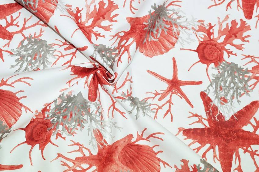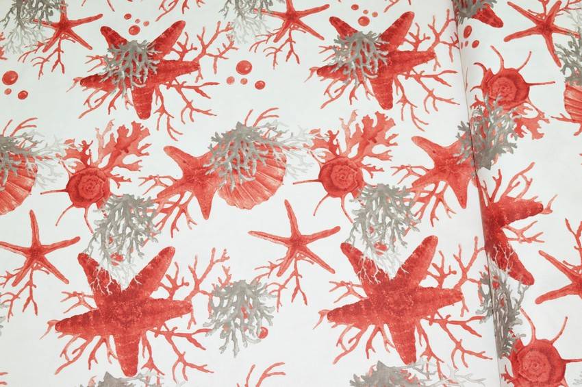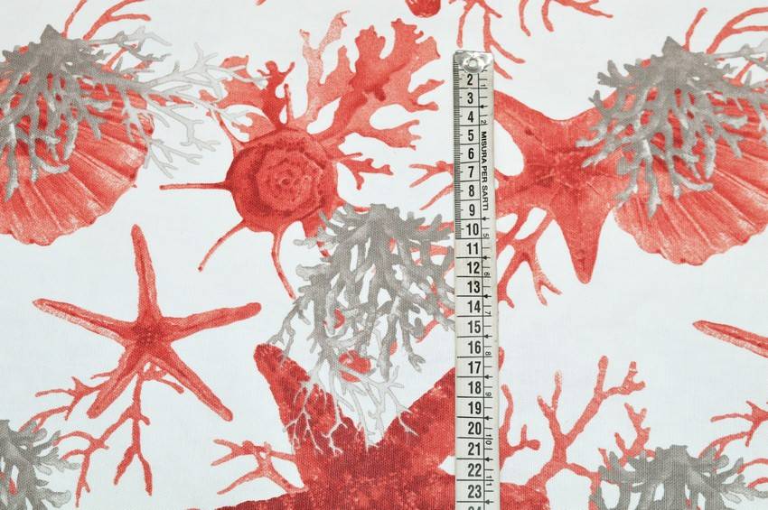 Bellissimo tessuto Panama in puro cotone con fondo naturale abbellito dalle splendide figure marine rosse a contrasto. Utilizzato per tovagliati, lavori di arredo cucina e arredo casa come copricuscini, mantovane copricassettoni e per piccoli progetti come presine ed oggettistica varia.
