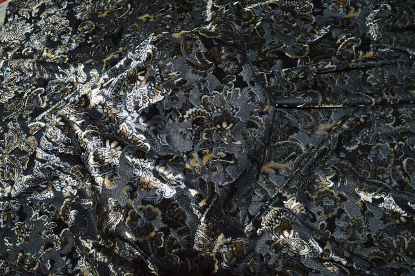 Vendita online tessuti abbigliamento georgette / chiffon dèvorè tessuto ciniglia devoreh fantasia cashmere nero oro - Tessuti & Stoffe