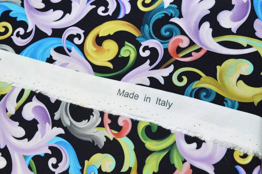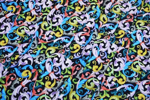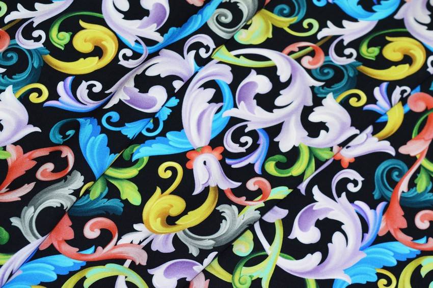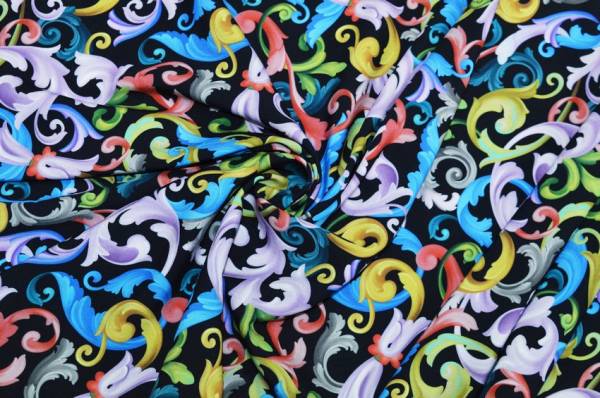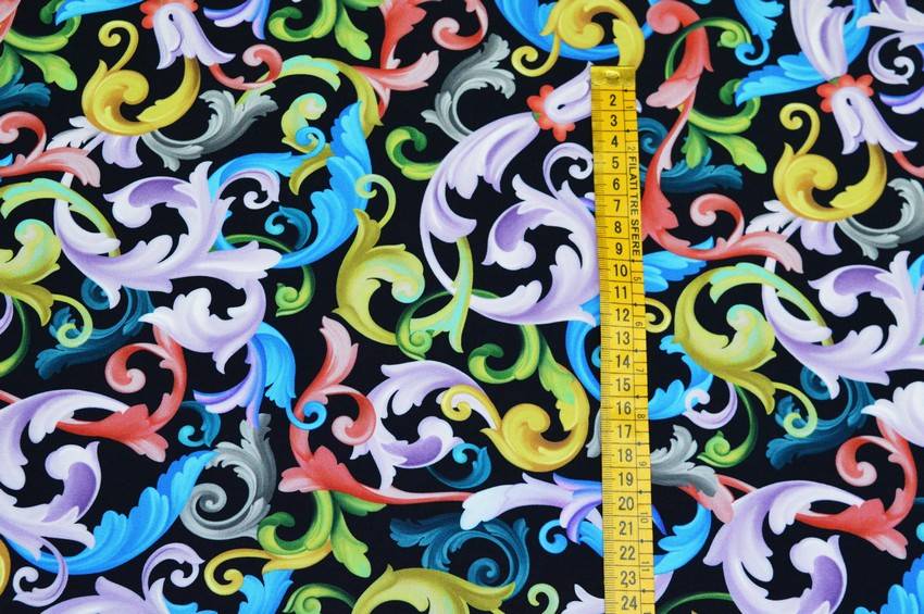 Splendido tessuto di pura viscosa molto fresca e leggera al tatto. Il fondo nero viene arricchito dalla variopinta fantasia stile barocco la quale mescola armoniosamente differenti tonalità di colori. A sottolinearne la qualità vi è la certificazione di provenienza 100%Made in Italy stampata su entrambe le cimose. Cadente e morbido si adatta perfettamente alla realizzazione di numerosi modelli per capi d'abbigliamento primavera/estate come graziose camicette, gonne lunghe ed abitini.