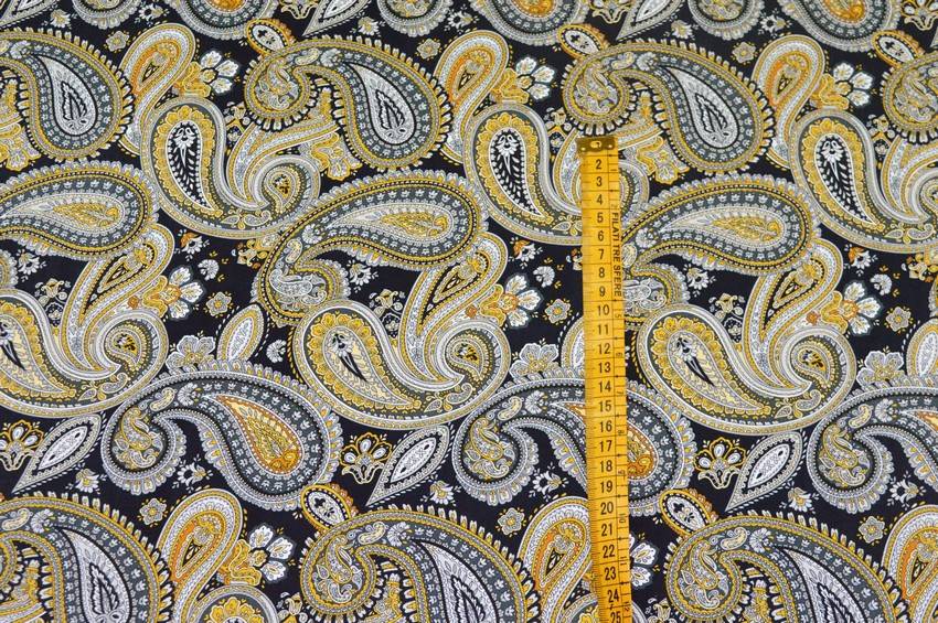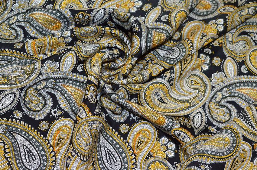 Ottimo tessuto 100%Made in Italy in pura viscosa di mano leggera, liscia, fresca e di media coprenza. Il fondo nero viene decorato dalla splendida fantasia boteh composta da differenti tonalità di grigio con delicati dettagli gialli a contrasto. Consigliato per la realizzazione di capi d'abbigliamento estivi quali scamiciate ed abitini.