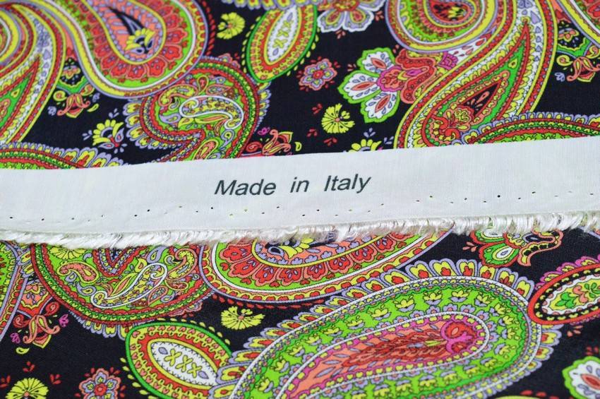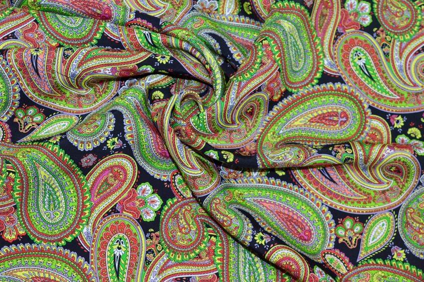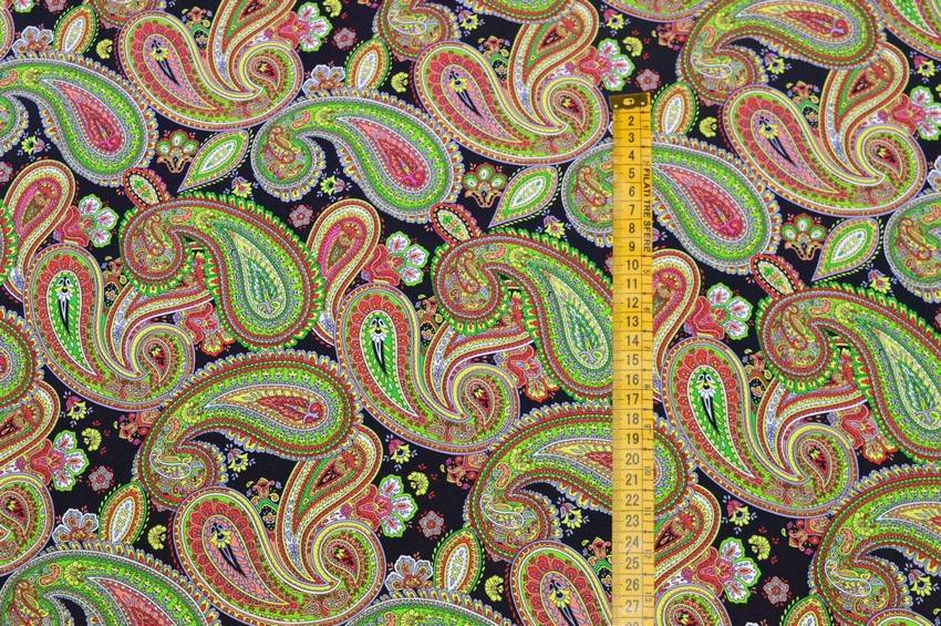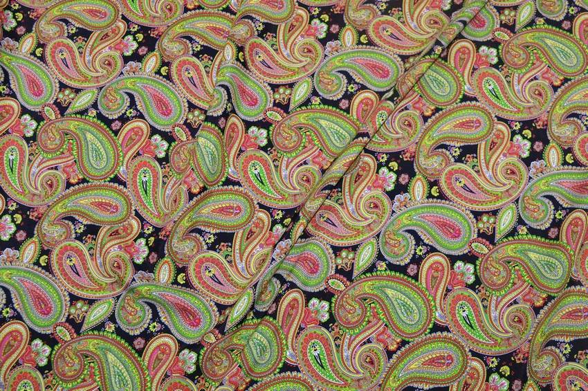 Ottimo tessuto 100%Made in Italy in pura viscosa di mano leggera, liscia, fresca e di media coprenza. Il fondo nero viene decorato dalla splendida fantasia boteh composta da differenti tonalità di verde e rosa la quale regala vivacità ed unicità alla stoffa. Consigliato per la realizzazione di capi d'abbigliamento estivi quali scamiciate ed abitini.