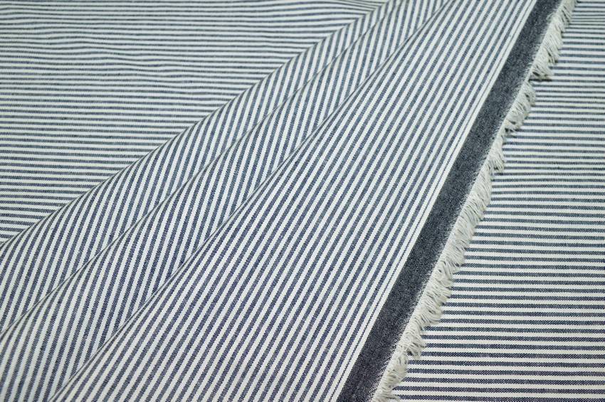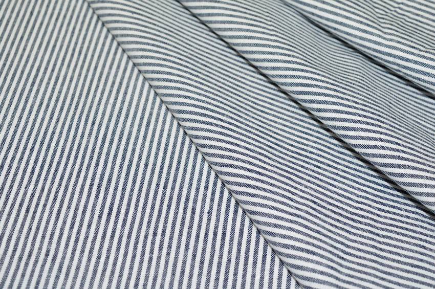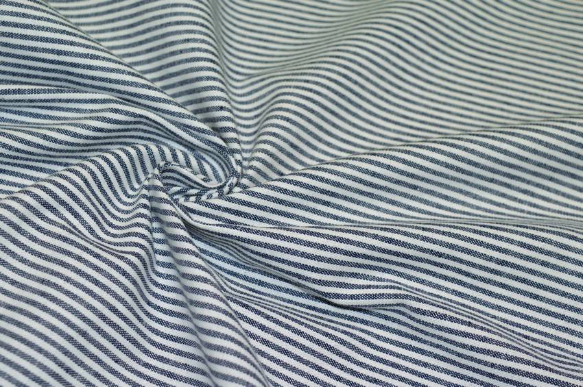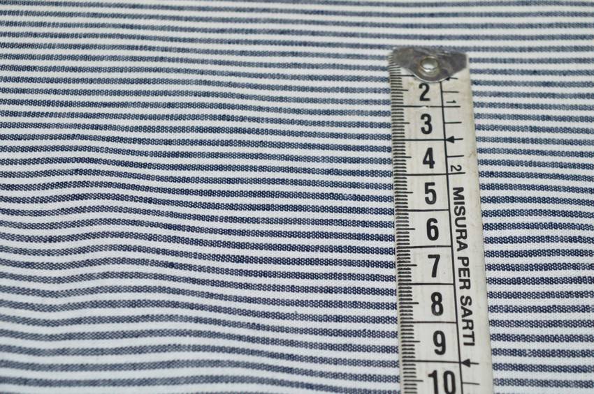 Tessuto realizzato in cotone dalla mano leggermente elasticizzata. Al tatto si presenta inoltre piacevolmente fresco e liscio. Il fondo bianco viene delicatamente abbellito dalla micro fantasia blu composta da linee di 2 mm ciascuna. Grazie alla sua media pesantezza si presta perfettamente alla confezione di svariati capi d'abbigliamento estivi quali pantaloni, gonne, abiti chemisier e giacchette