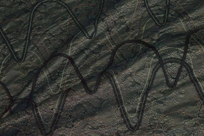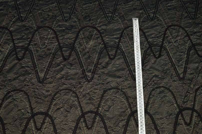 Elegante tessuto con fondo in taffetas dalla particolare colorazione bronzo composta dall'unione di due filati, beige e nero. La base viene inoltre decorata dalla graziosa applicazione retata nera unita a linee ondulate ricamate le quali donano unicità e movimento alla stoffa. La sua struttura rigida e sostenuta ne permette l'utilizzo per la realizzazione di capi d'abbigliamento elegante quali giacche ed abiti anche dai modelli voluminosi. Utilizzato anche per rivestimento esterno di cuscini.