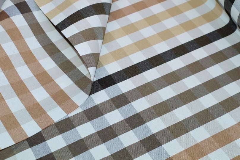 Tessuto poliestere/acrilico in altezza 140 cm, peso 250 gr al MTL,  con trattamento repellente al teflon che lo rende impermeabile e resistente alle macchie d'olio di sugo di vino ed a  qualsiasi altra macchia di natura grassa ed oleosa, si consiglia di pulire con un panno umido e di lavare periodicamente a massimo 30°.