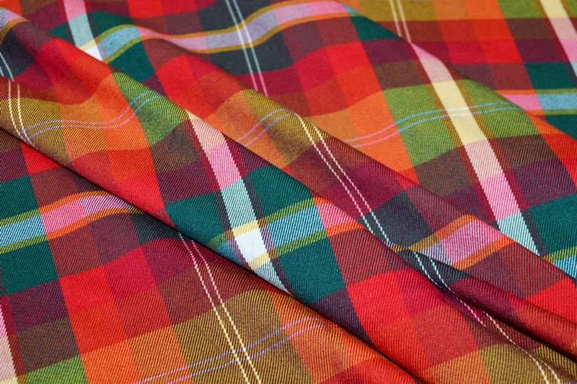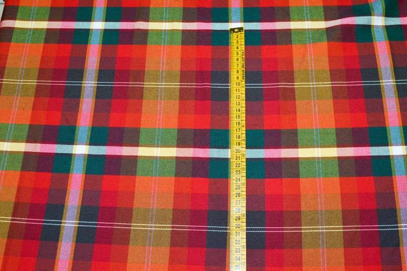 Tessuto tartan multicolor composto da scacchetti i quali uniscono armoniosamente differenti tonalità quali rosso, arancio e verde. Al tatto si presenta pettinato, elasticizzato e di medio peso, ottimale per la realizzazione di gonne dritte o a pieghe, giacche, pantaloni ed altre tipologie di capi d'abbigliamento autunno/inverno uomo/donna.