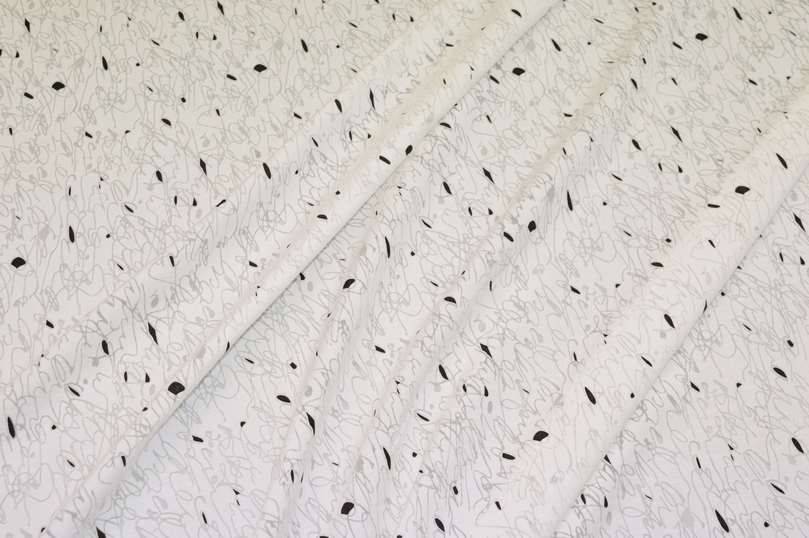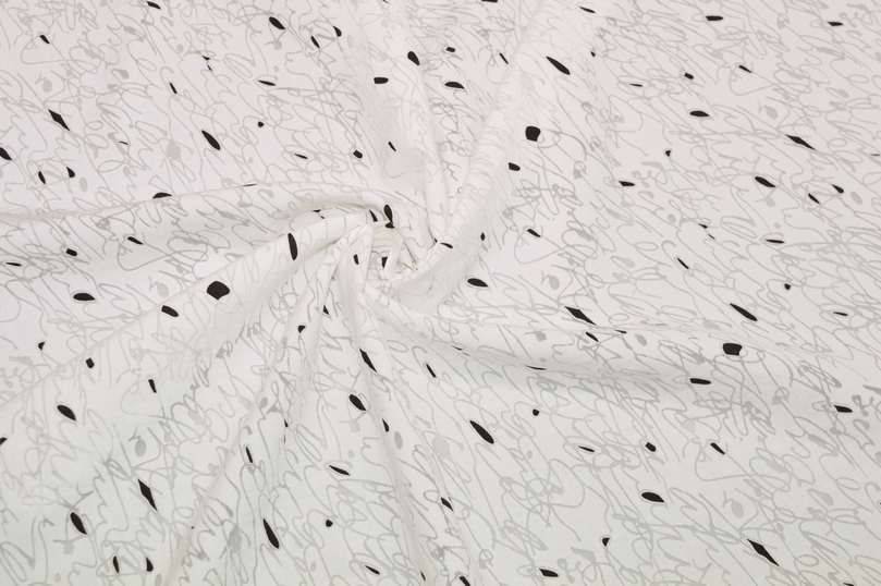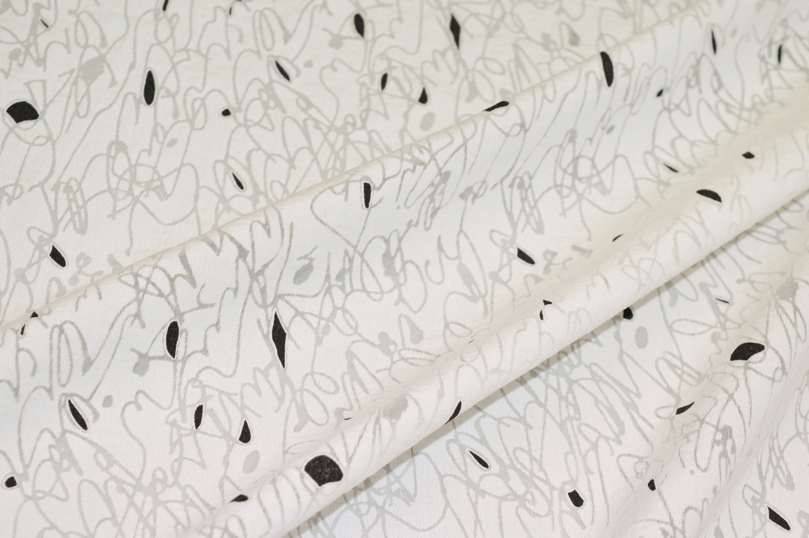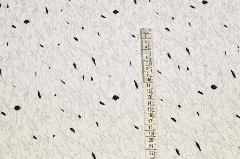 Tessuto realizzato in viscosa molto leggero e cadente al tatto. Il fondo si presenta delicato grazie alla sua colorazione bianco naturale (non bianco ottico, non giallino) unita alla caratteristica lavorazione trasparente che ricrea l'effetto vedo non vedo delle stoffe in devoreh. A completare il disegno vi sono piccole figure geometriche nere a contrasto. Ne viene consigliato l'utilizzo per confezionare raffinate camicette, graziosi foulard, stole coprispalle ed abitini. Idoneo anche per ricreare applicazioni su capi già confezionati come volant o balze.