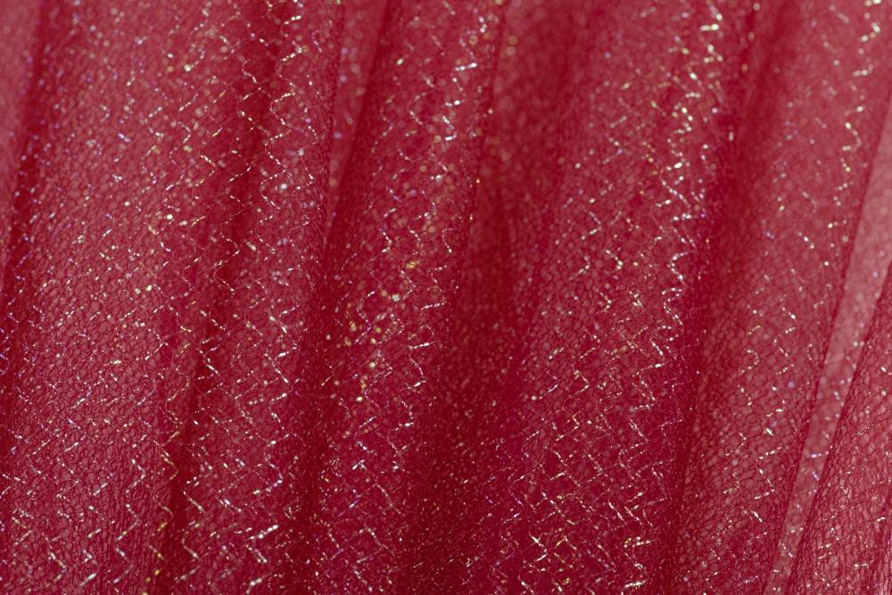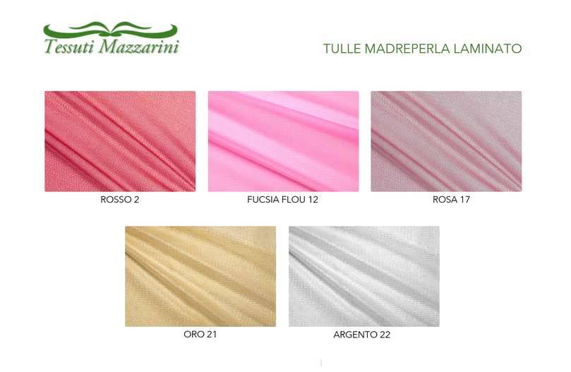 Bellissimo tulle dalla struttura semirigida e dall'aspetto trasparente e luminoso conferito dalla leggera laminatura disponibile in cinque varianti colore: Rosso, Fucsia flou, Rosa, Oro ed Argento.