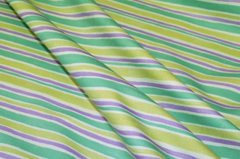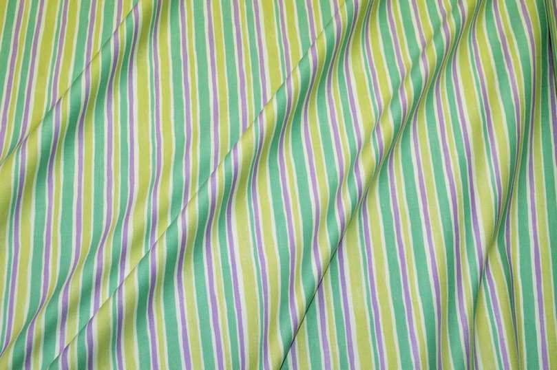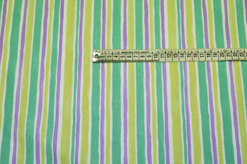 Tessuto piquet millerighe in puro cotone con giocosa stampa la quale alterna irregolari linee verticali verdi, viola e turchesi. Ottimale per essere adoperato nella realizzazione di abbigliamento e accessori per bambini e neonati come sacchi copripiumino, copricuscini, rivestimento culla e lenzuolini.