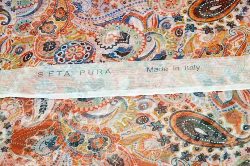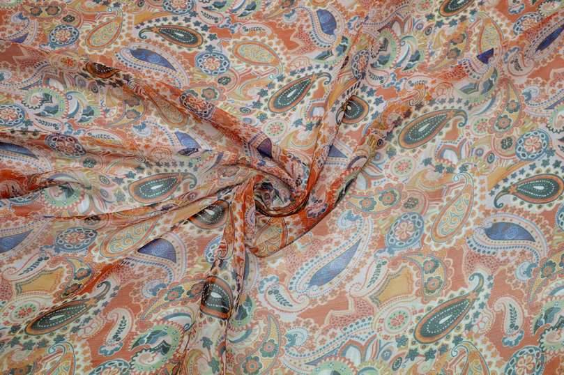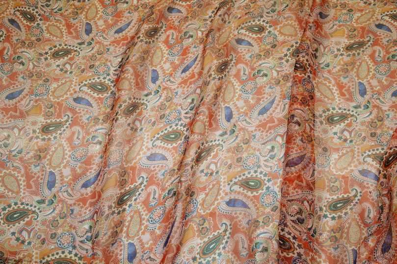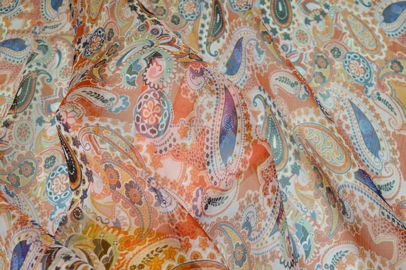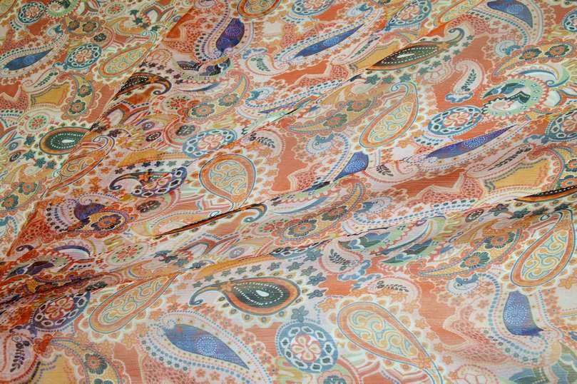 Il fondo viene decorato dalla colorata fantasia paisley la quale unisce differenti tonalità di arancio per un risultato armonioso, variopinto ed originale. Perfetto per confezionare capi d'abbigliamento primaverili ed estivi quali camicette, abitini, gonne, foulard e stole coprispalle.