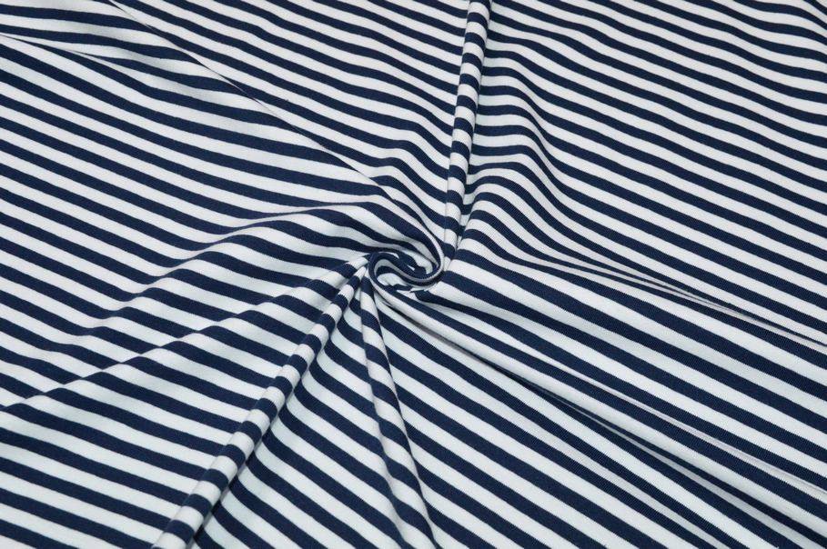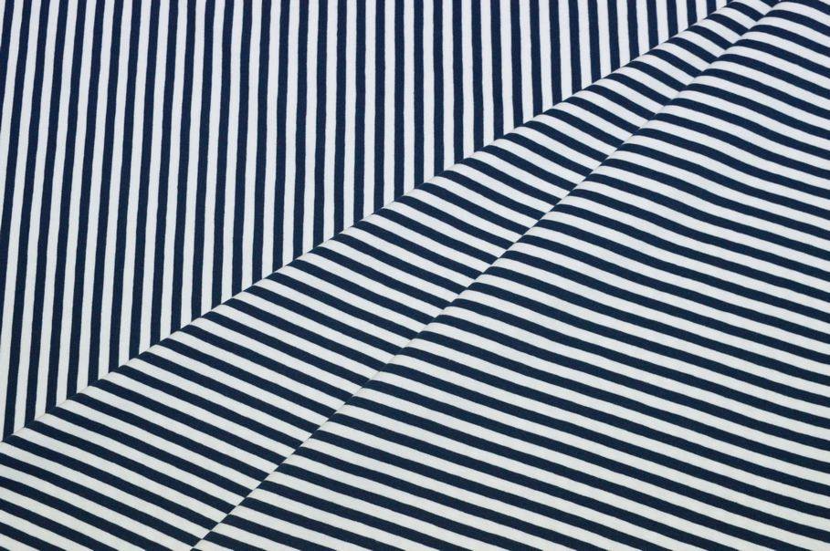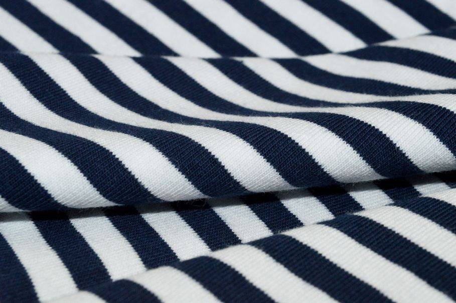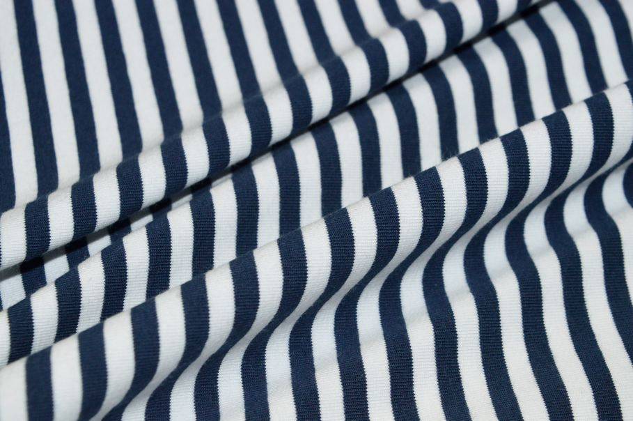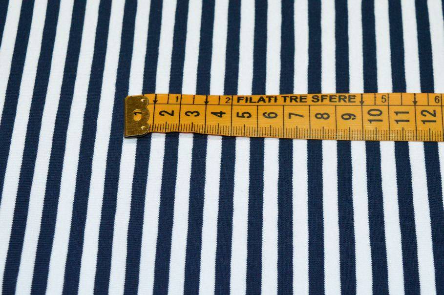 Con il 5% di elastan risulta inoltre elasticizzata da entrambi i versi, qualità che rende il prodotto molto versatile per ogni fisicità. A completare il design del prodotto vi è una rigatura verticale (da cimosa a cimosa) che alterna sottili linee bianche e blu. Misura righe 5 mm.