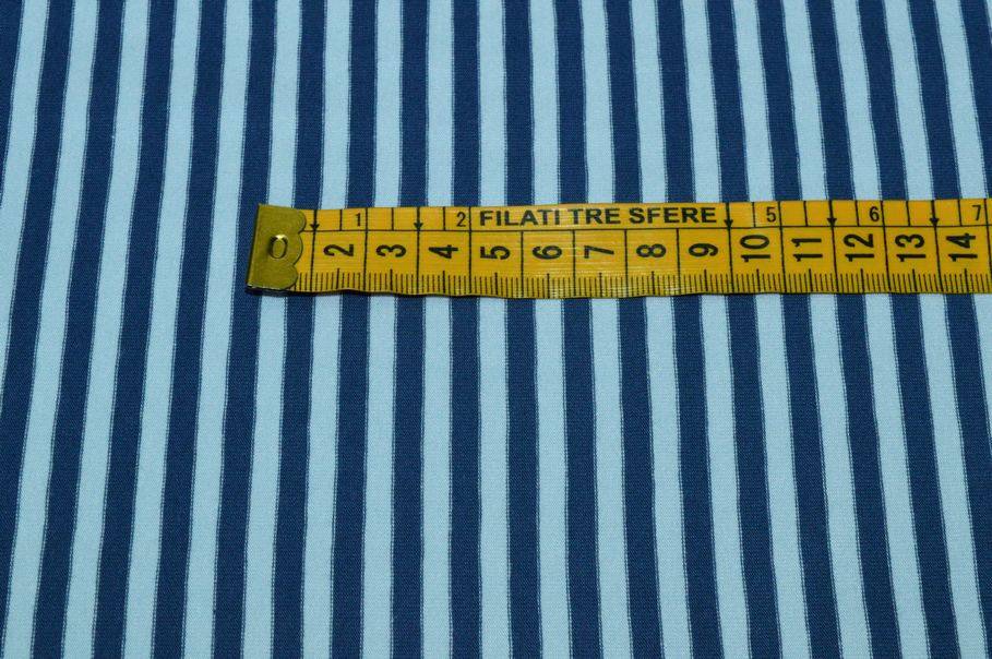 Con il 5% di elastan risulta inoltre elasticizzata da entrambi i versi, qualità che rende il prodotto molto versatile per ogni fisicità. A completare il design del prodotto vi è una rigatura verticale (da cimosa a cimosa) che alterna sottili linee azzurre e celesti. Misura righe 5 mm.