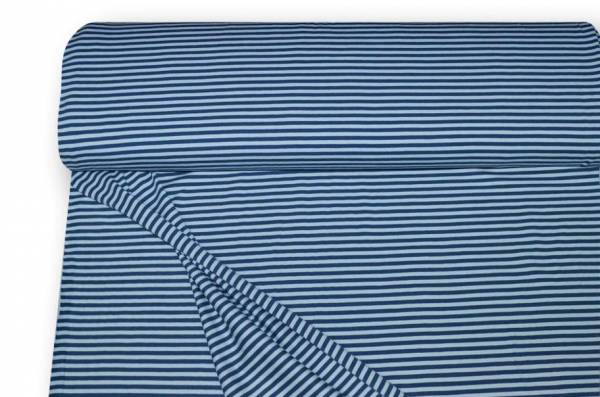 Con il 5% di elastan risulta inoltre elasticizzata da entrambi i versi, qualità che rende il prodotto molto versatile per ogni fisicità. A completare il design del prodotto vi è una rigatura verticale (da cimosa a cimosa) che alterna sottili linee azzurre e celesti. Misura righe 5 mm.