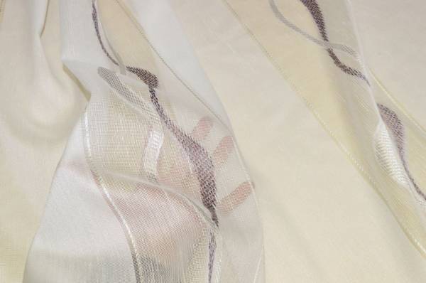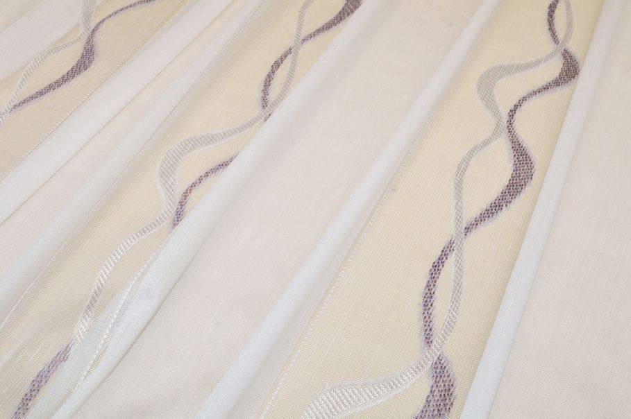Tessuto per tende con cimosa parlata la quale riporta la provenienza 100%Made In Italy del prodotto. Il fondo bianco alterna fasce di coprenza differente permettendo alla luce di filtrare illuminando l'ambiente senza rinunciare alla privacy. A completare il motivo fantasia vi sono delicate linee ondulate bianche e lilla le quali offrono un prodotto di alto design. Cadente e leggera risulta ottimale per creare tende arricciate con morbide e sinuose onde.