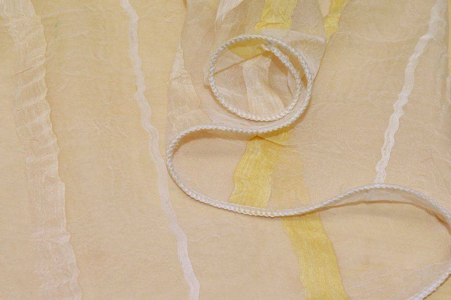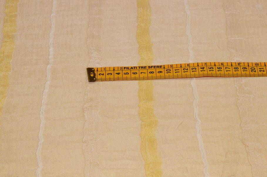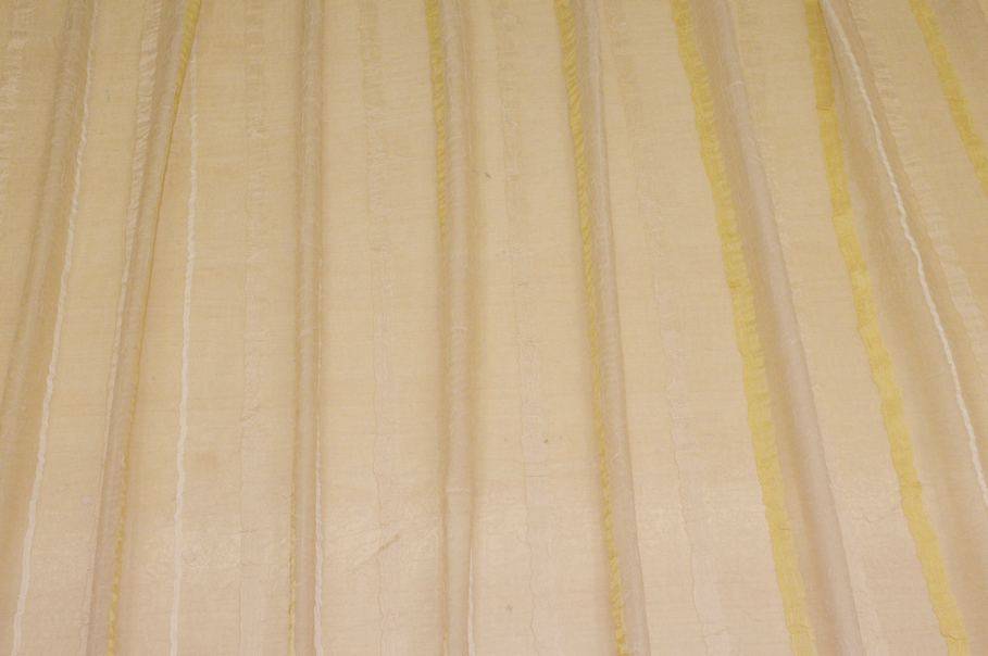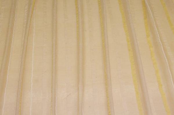 La base sfoggia una deligatissima e giocosa fantasia a righe verticali composta da irregolari fasce gialle e color cipria. Giocoso e colorato è ottimale per realizzare tende arricciate, anche per camerette bimbo/a.