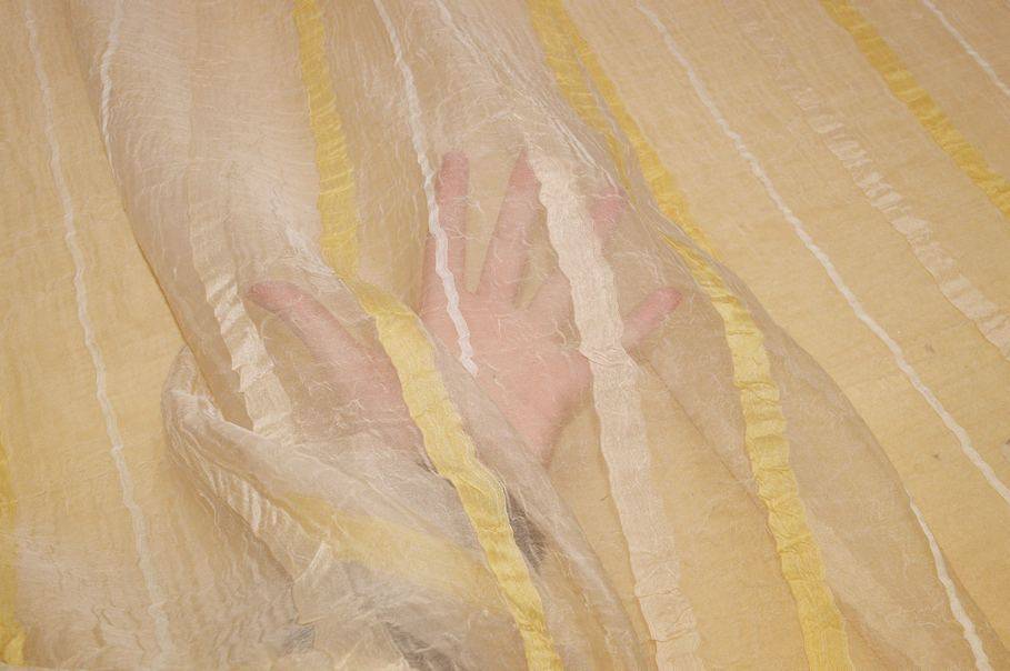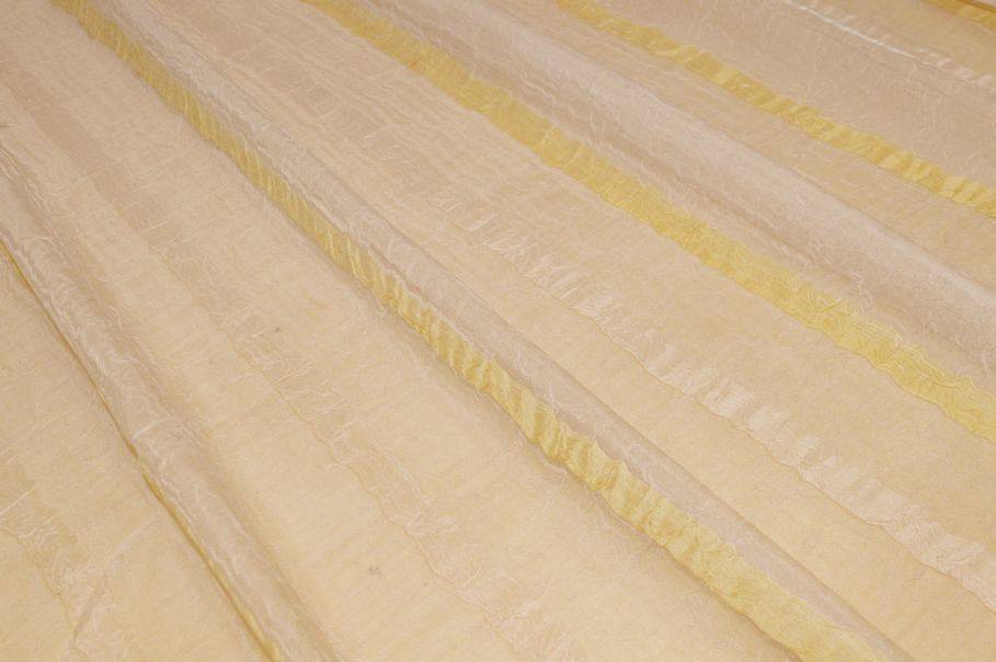 Il fondo risulta molto trasparente ed offre un grazioso effetto stropicciato composto da minuziose e delicate increspature tipiche di questa lavorazione distribuite su tutta la lunghezza. Una volta affisso all'apposito supporto risulterà inoltre molto leggero e cadente.
