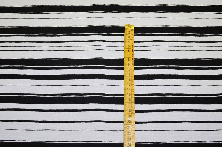 Ottimo tessuto in viscosa di mano leggermente elasticizzata, fresca e leggera con doppio dritto decorato dalla splendida fantasia in negativo a righe orizzontali bianche e nere la quale da un lato lascia prevalere il nero, dall'altro il bianco. Perfetto per confezionare scamiciate, giacchettine, vestiti, pantaloni ed altri molteplici capi adatti alle stagioni primavera/estate.
