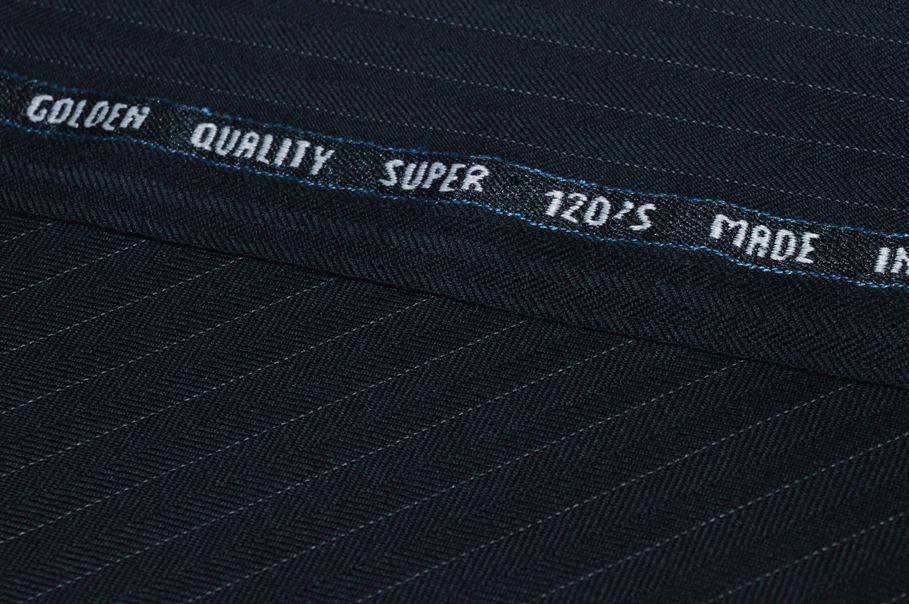 Ottimo tessuto con cimosa parlata realizzato interamente con le migliori fibre naturali di pura lana tasmania la quale regala una splendida mano liscia e pettinata. La stoffa presenta un fondo blu notte (molto scuro, quasi tendente al nero) decorato dalla minuta spinatura in tono. A completare il raffinato design del prodotto vi è inoltre una minimale ed elegante gessatura di 9 mm.