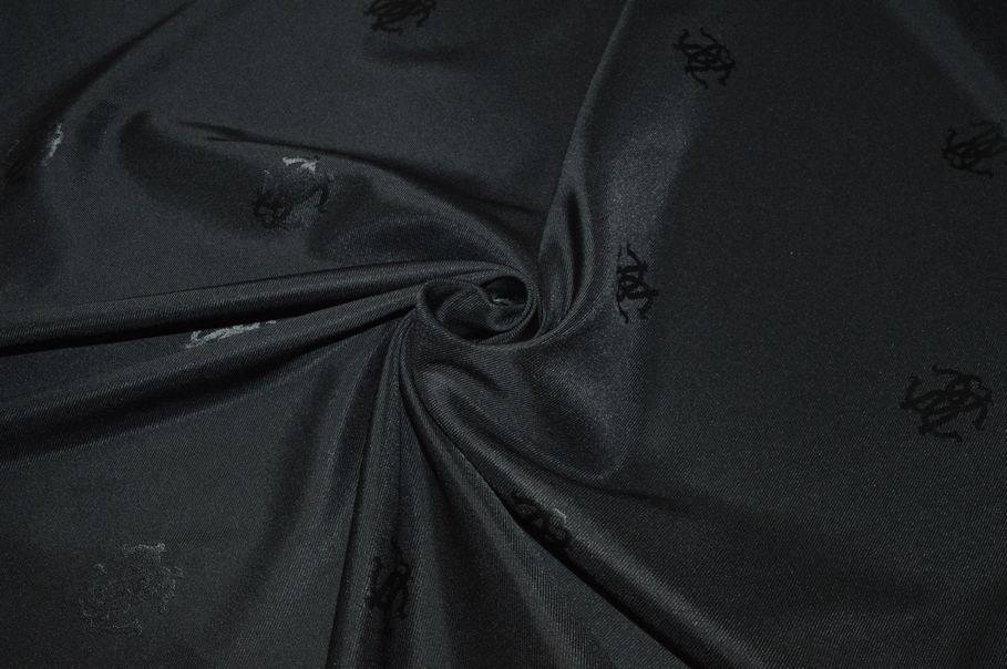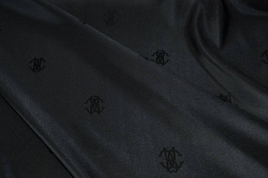Fodera naturale in acetato dalla mano elasticizzata e coprente di fondo unito nero decorato dal logo ricamato in tinta. Utilizzato per la foderatura e rifinitura degli interni di ogni capo di abbigliamento come gonne, giacche ed abiti.