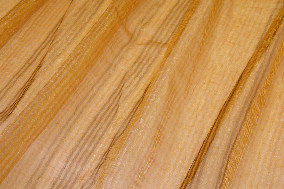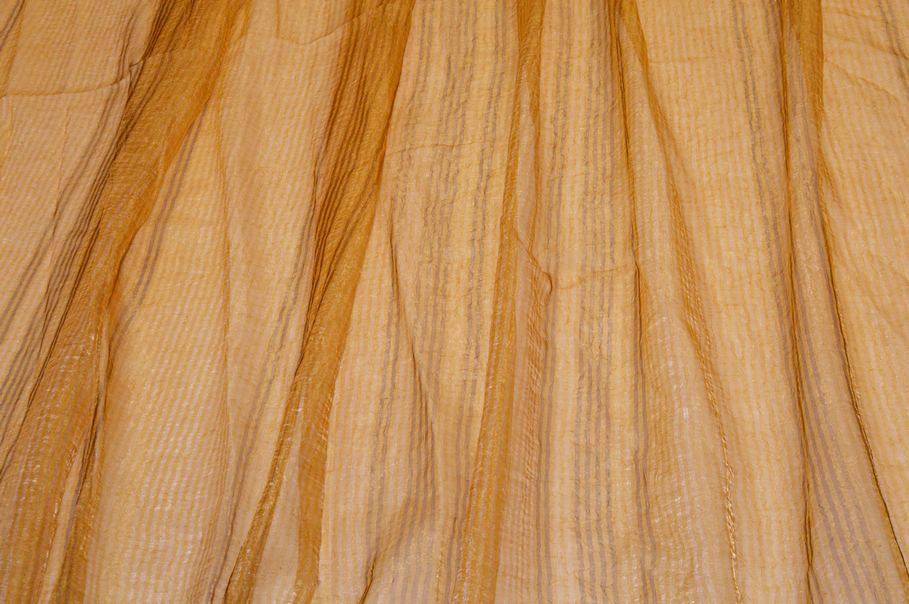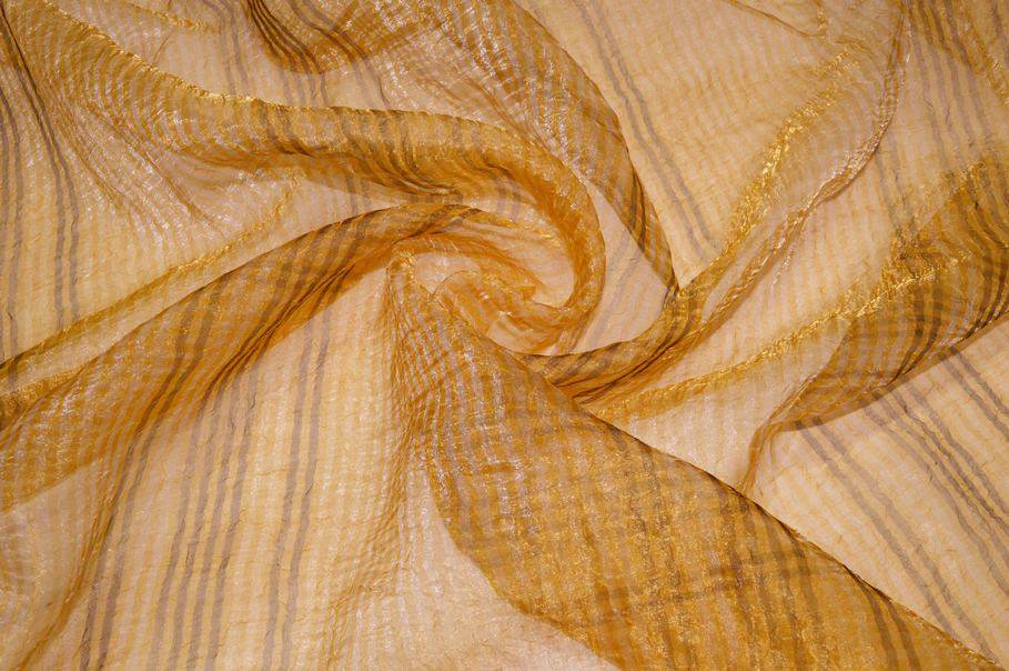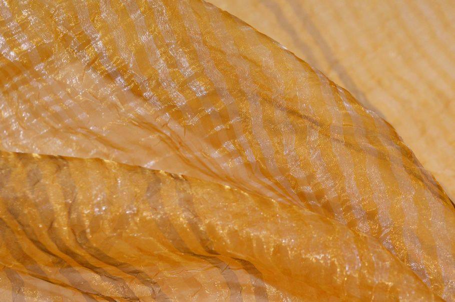 Tessuto in organza con effetto stropicciato dalla raffinata e preziosa colorazione dorata. Il tessuto nasce per la confezione di tendaggi, in particolare di tende arricciate, dall'aspetto molto cadente, leggero e trasparente. Il fondo dalla brillante colorazione viene arricchito ulteriormente dal delicato rigatino verticale in tono.