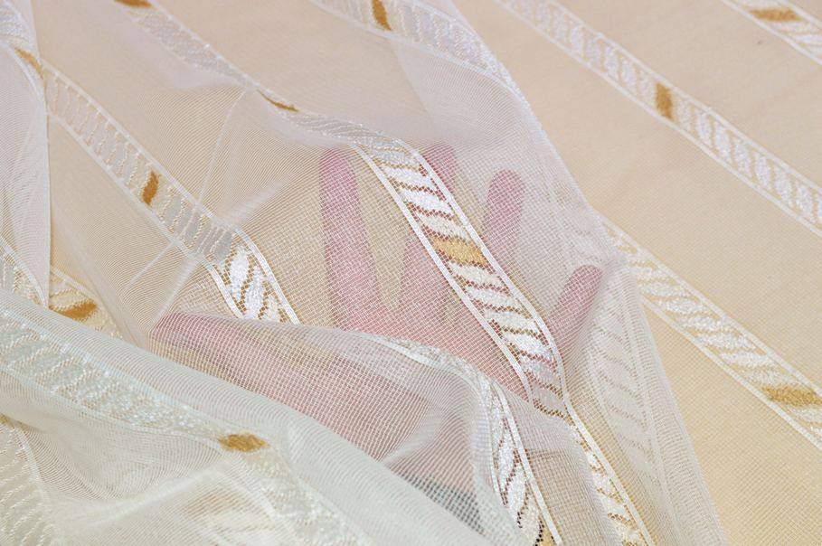 Il fondo in tulle viene decorato da fasce verticali composte da piccoli segmenti coprenti. A completare il motivo geometrico vi sono alcuni dettagli dorati per un design semplice, delicato, ma di grande impatto.