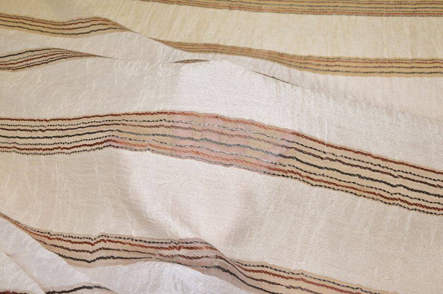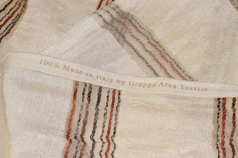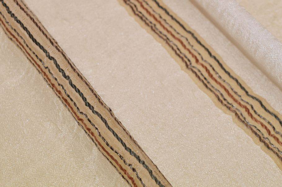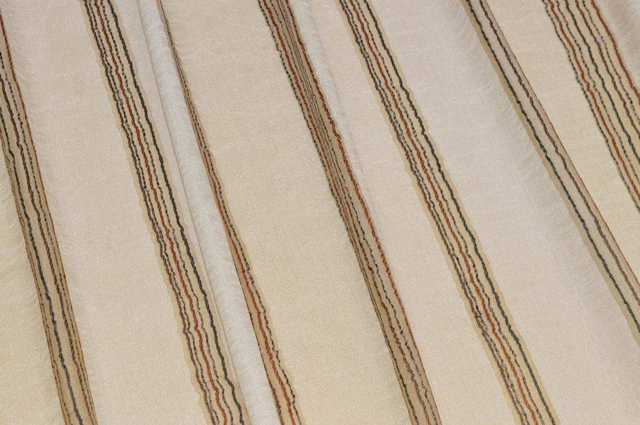 Il fondo panna risulta leggero, cadente ed abbastanza coprente, ma filtrante alla luce. Si aggiunge inoltre un grazioso effetto stropicciato composto da minuziose e delicate increspature tipiche di questa lavorazione. A completare la decorazione vi sono sottili ed irregolari linee verticali grigie e color bruciato. Distanza fasce 7 cm circa.