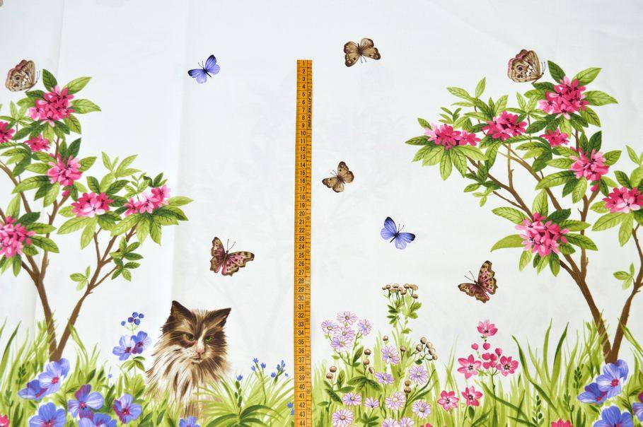 Il fondo bianco viene decorato da minute e graziose farfalle distribuite nella fascia centrale del tessuto. Ai lati vi sono invece due fasce con stampa decorativa a tema animali: su una cimosa sono raffigurati solamente gatti, nell'altra unicamente figure canine.