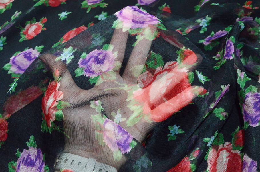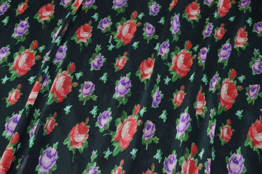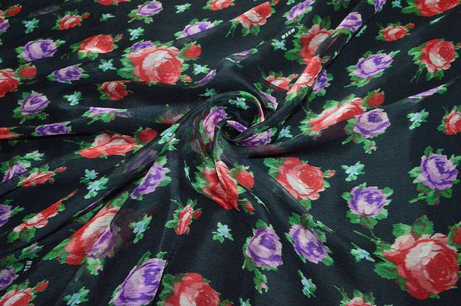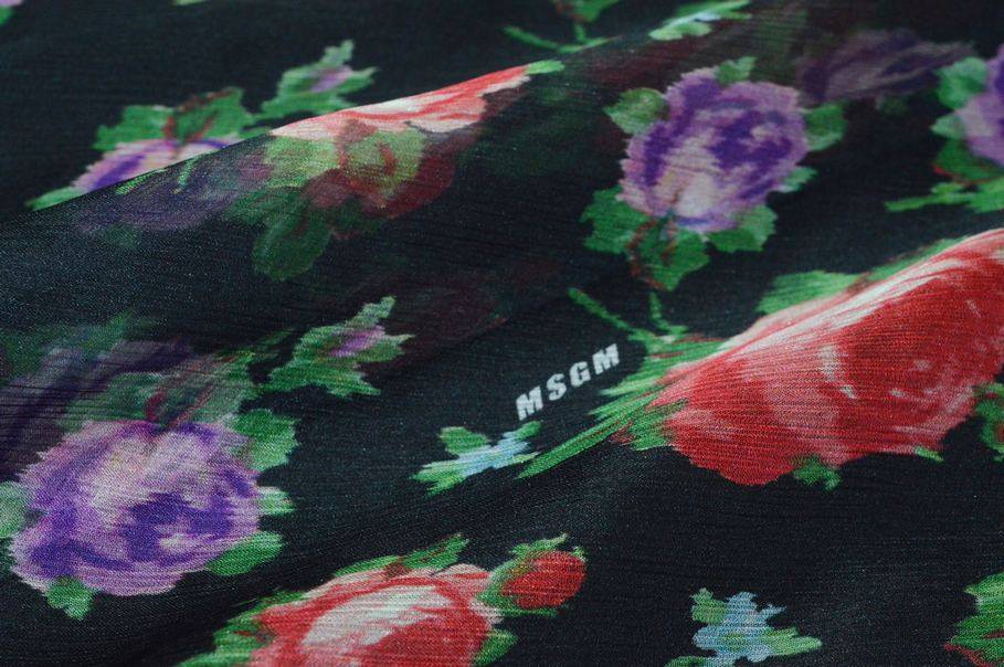 Tessuto chiffon di pura seta con logo MSGM distribuito sul fondo. L'articolo si presenta con un particolare effetto crepon caratterizzato dalla superficie a pieghe irregolari che gli conferiscono la tipica arricciatura delle stoffe plissettate. Il prodotto viene favorito per creazioni primaverili ed estive per merito della sua mano leggera, cadente, molto fresca e trasparente. La colorazione selezionata per il fondo è un classico nero intenso che mette in risalto la fantasia fiorata rossa e viola. Grazie alla sua leggerezza viene scelto per capi d'abbigliamento primavera/estate quali abiti corti e lunghi, gonnelline con volant, camicette velate ed applicazioni come balze su indumenti già confezionati.