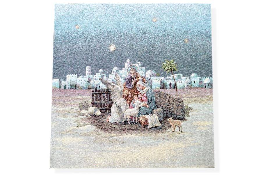 Tessuto fantasia a tema natalizio con raffigurazione della Natività in Gobelin piazzata cm 47x47. Articolo utilizzato per realizzare graziosi copricuscini, sottopiatti, tovagliette e lavori di cucito creativo vario.