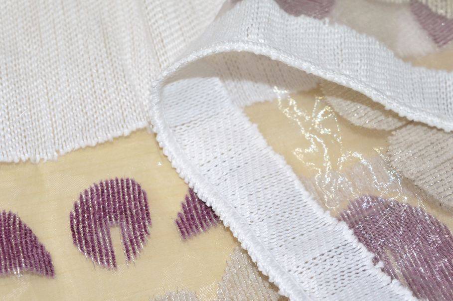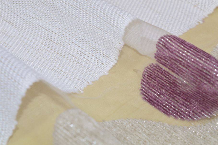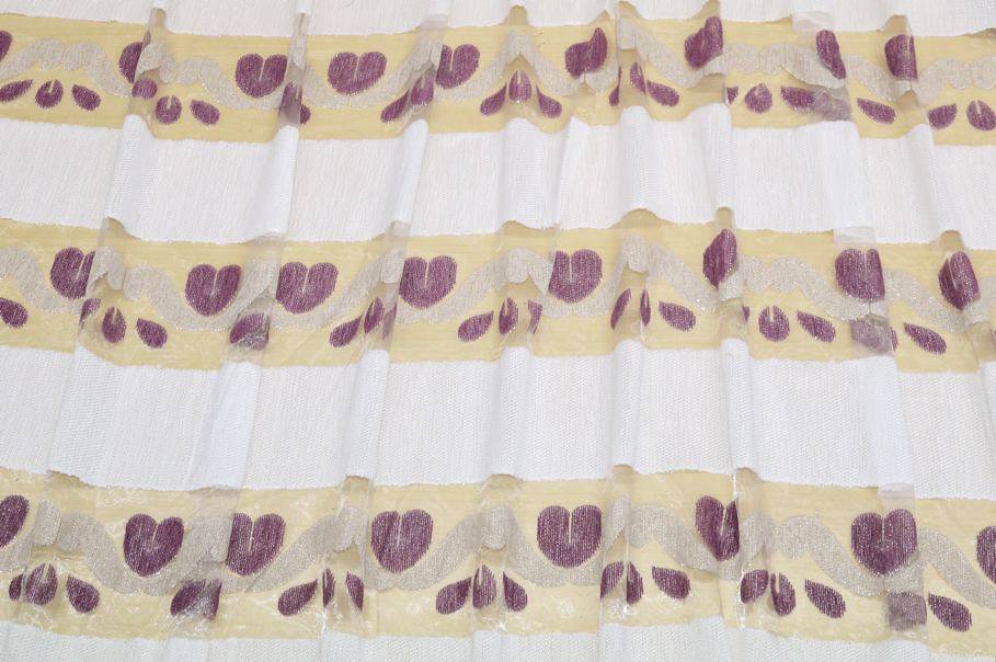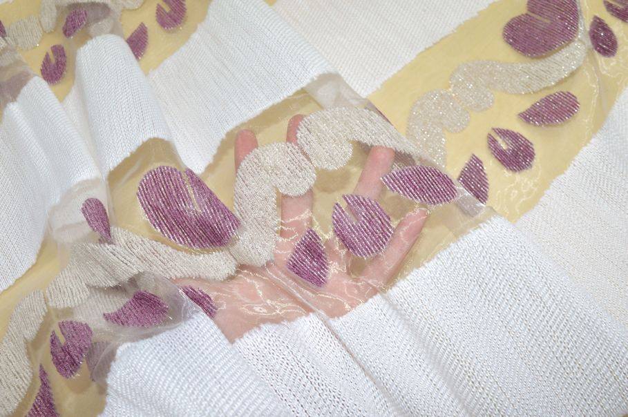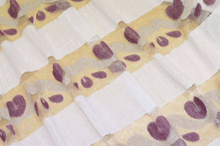 Tessuto per tendaggi dal particolare design composto dall'unione di lavorazioni differenti. Il fondo mescola fasce bianche di media coprenza con linee in organza trasparenti. Ad arricchire le aree velate troviamo inoltre un prezioso ricamo viola e beige a contrasto.