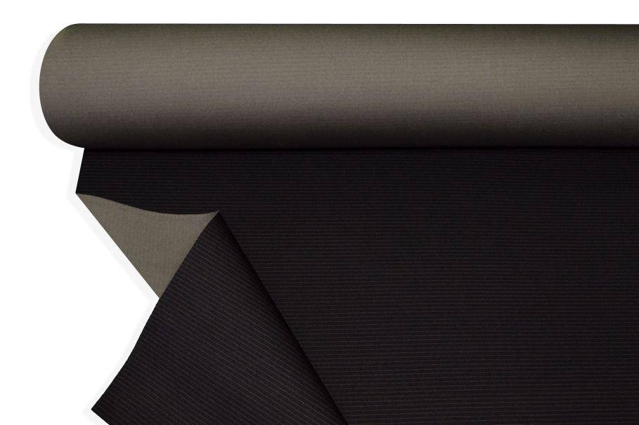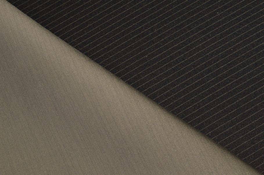 Il prodotto presenta due dritti: uno tinta unita color tortora, l'altro tinta unita nero con sottile gessatura tortora. La gessatura va da cimosa a cimosa. Consigliato l'utilizzo per la confezione di giacche e giubbettini.