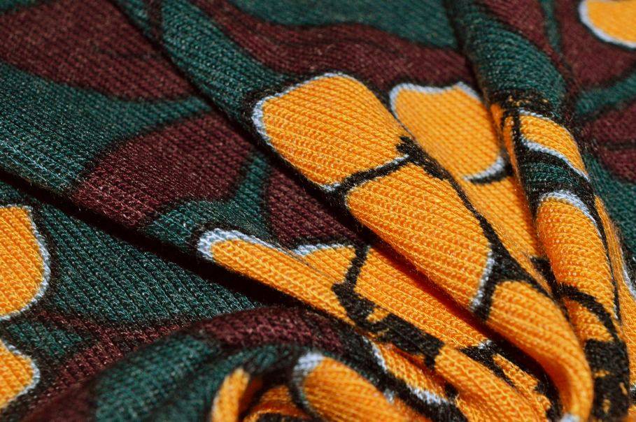 Tessuto in maglia naturale realizzato con filati misti di viscosa ed acetato. Una volta indossato risulta molto delicata sulla pelle regalando una completa sensazione di agio e comfort grazie alla sua mano leggermente elasticizzata, molto morbida, calda, ma leggera. Ad aumentare la bellezza del prodotto è il suo design caratterizzato dalla base verdone che mette in risalto i brillanti elementi fiorati color ocra.