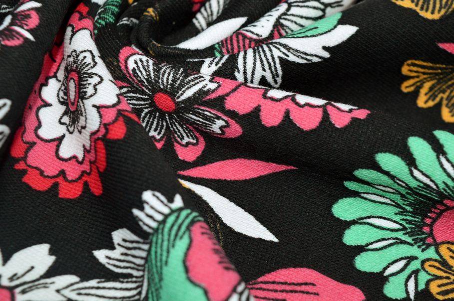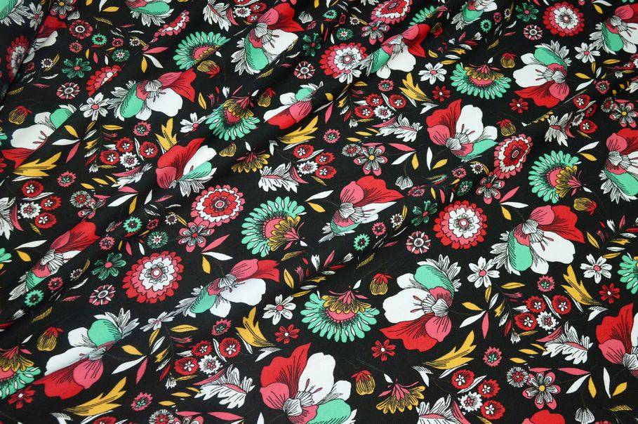 A differenziare la stoffa è la splendida fantasia floreale che unisce innumerevoli colorazioni le quali vivacizzano e decorano armoniosamente il fondo a tinta unita nero.